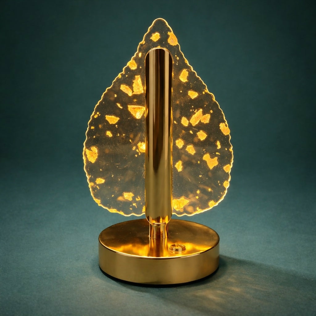 Bring elegance and warmth to your space with this beautifully designed leaf-shaped crystal table lamp. Featuring a sleek gold finish base and a uniquely crafted glowing leaf panel, this lamp creates a soothing ambient light that enhances any room décor. Perfect for bedside tables, living rooms, or office desks, it adds a modern yet artistic touch while delivering soft illumination. Ideal for gifting or elevating your home décor with a stylish lighting accent.
