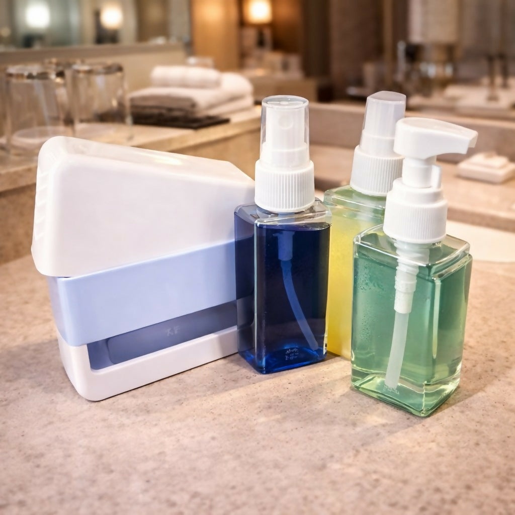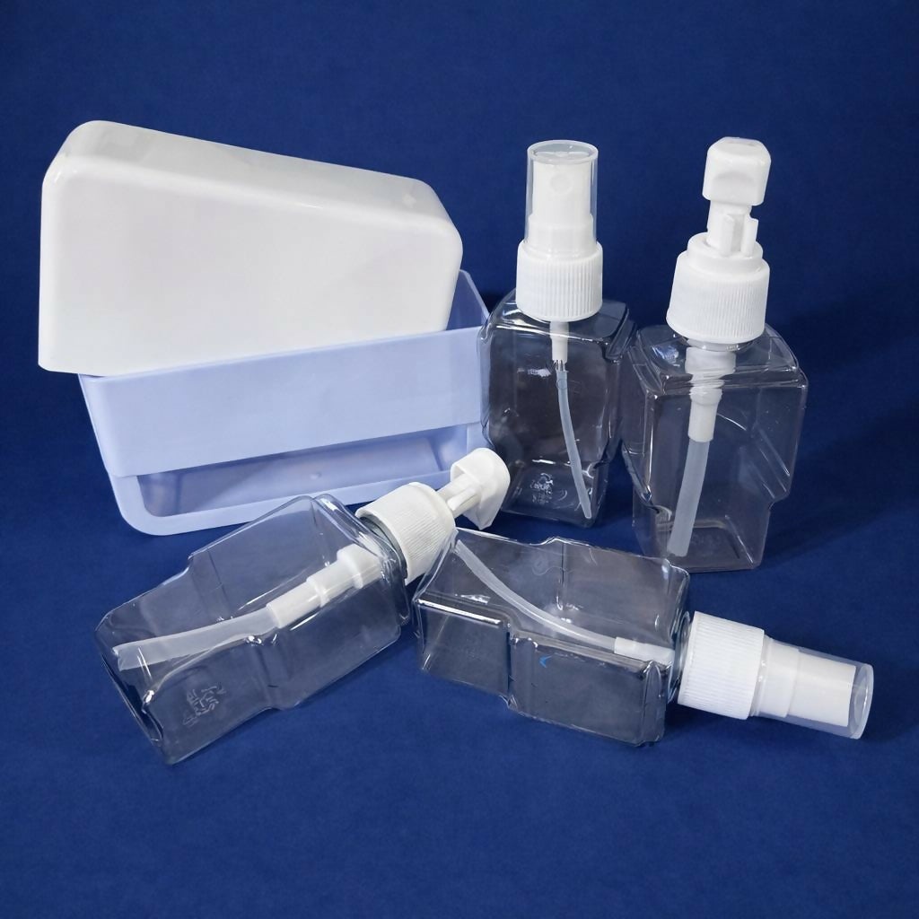 travel bottle set, refillable dispenser bottles, pump bottle set, spray bottle kit, toiletry kit, cosmetic bottles, portable bottles, shampoo bottle, lotion bottle, sanitizer bottle, travel accessories, leak proof bottles