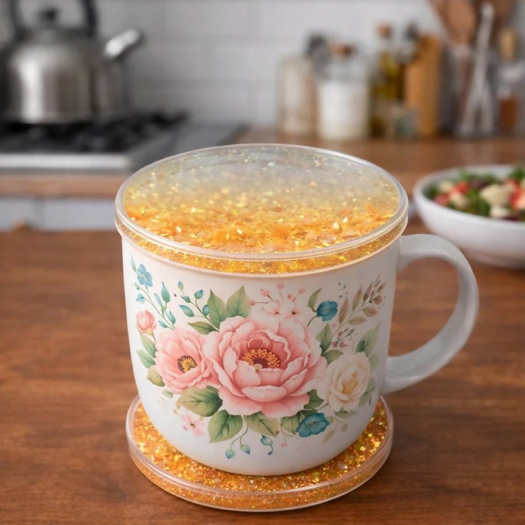 Add a touch of sparkle and functionality to your daily routine with this glitter resin cup lid and coaster set. Designed to keep your beverages protected while enhancing your table décor, this set combines style with practicality. The shimmering resin surface not only looks attractive but also helps prevent dust from entering your drink. Ideal for home, office, or gifting, it fits most standard mugs and adds a decorative charm to any space.