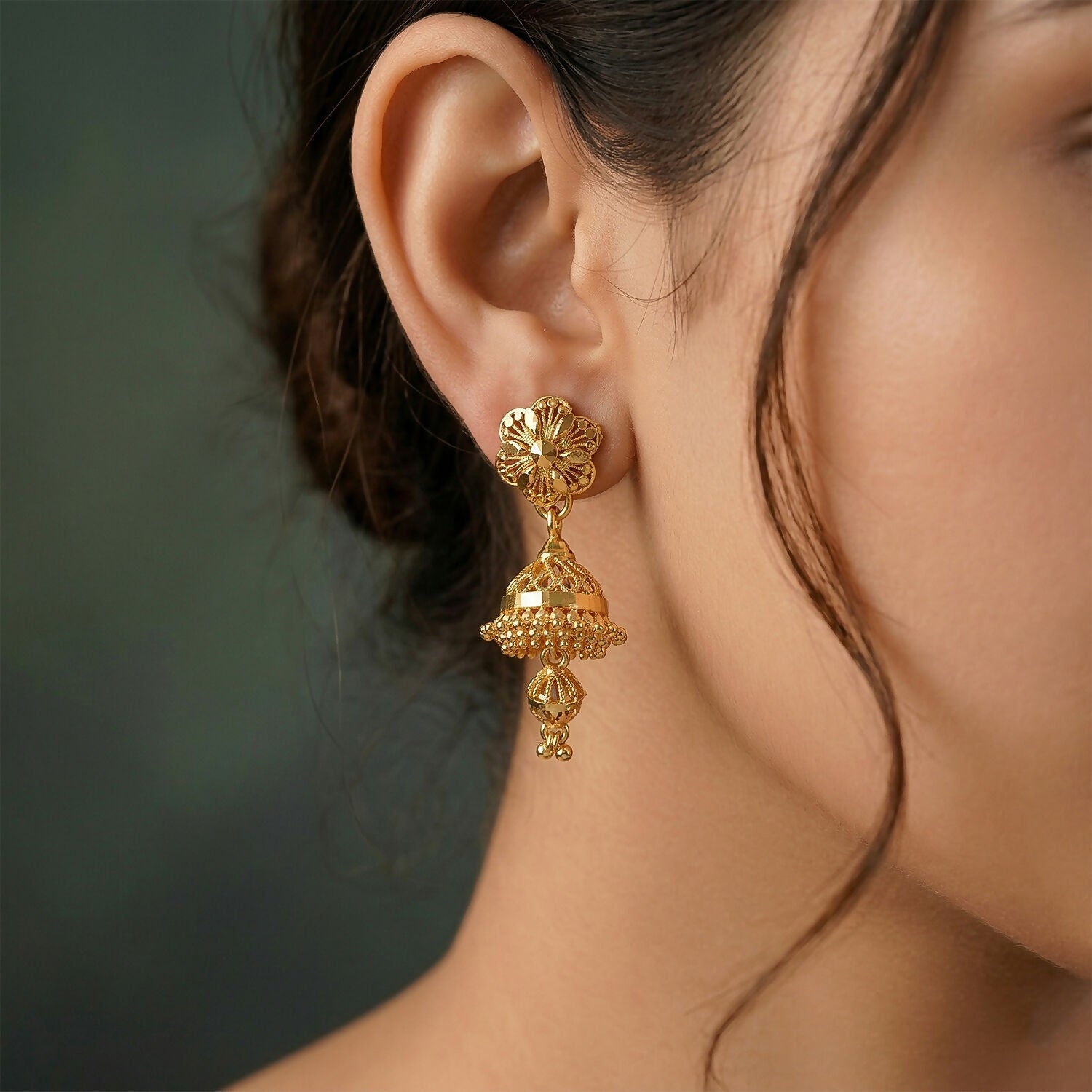 Design: Traditional Jhumka with Floral Motif and Filigree Detailing.