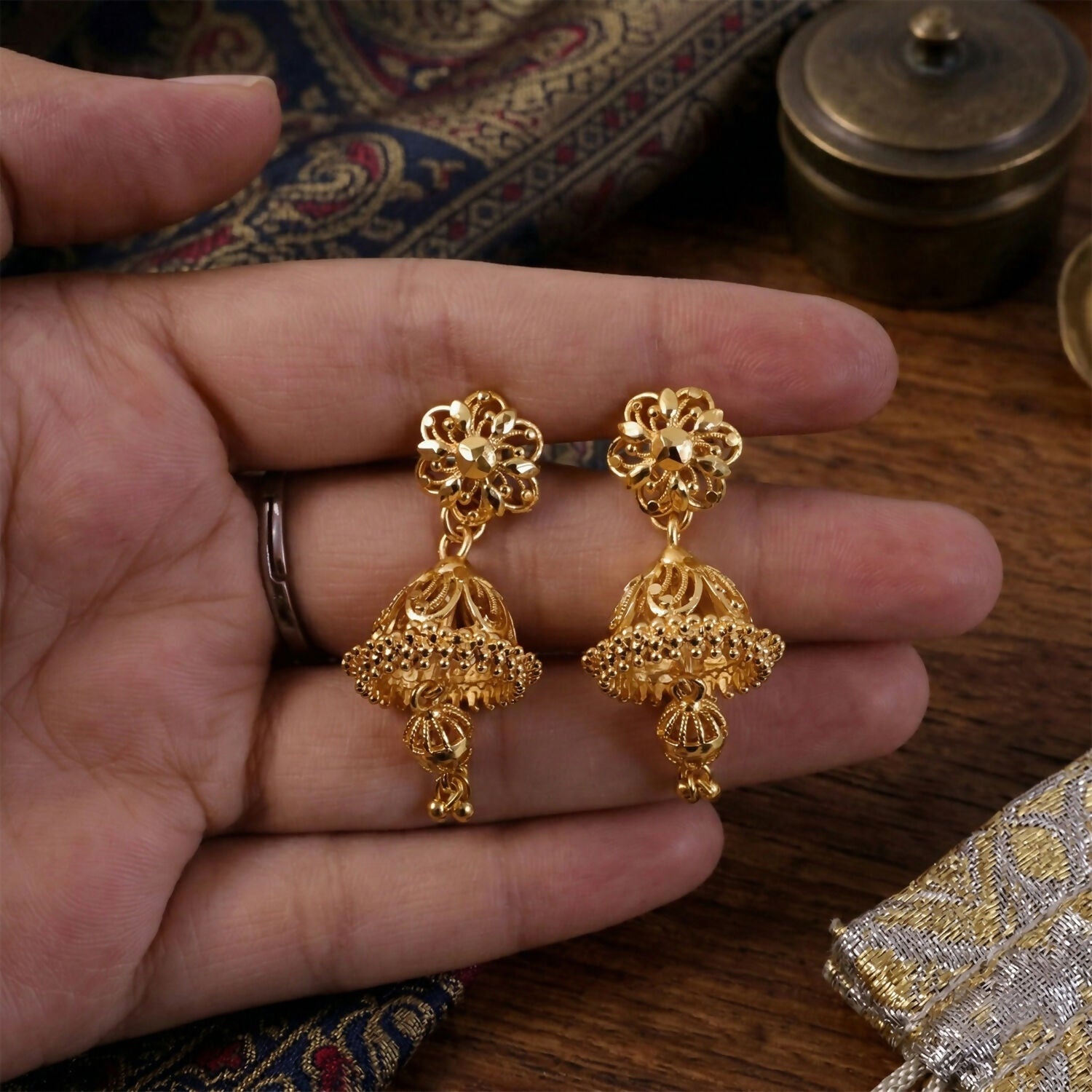 Design: Traditional Jhumka with Floral Motif and Filigree Detailing.