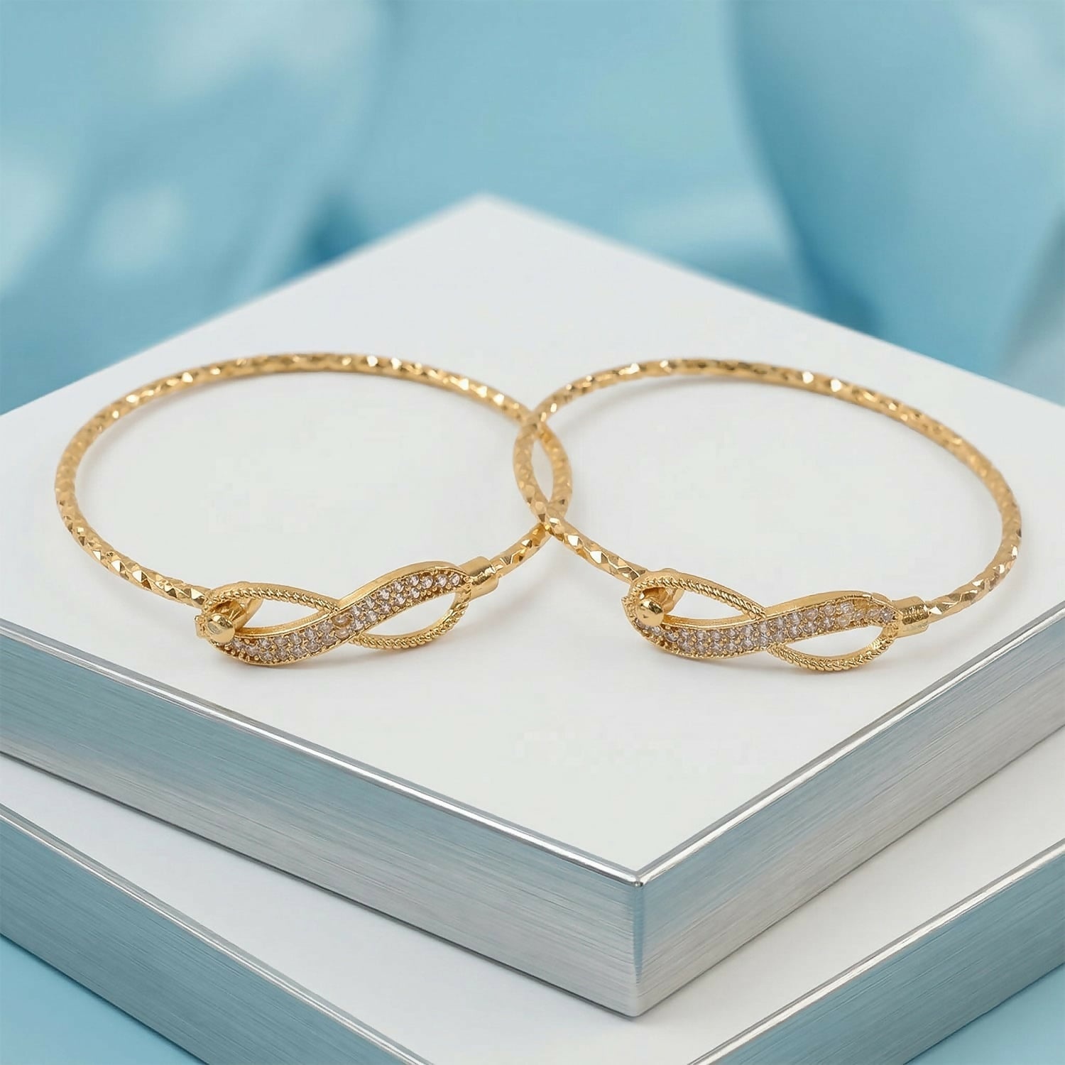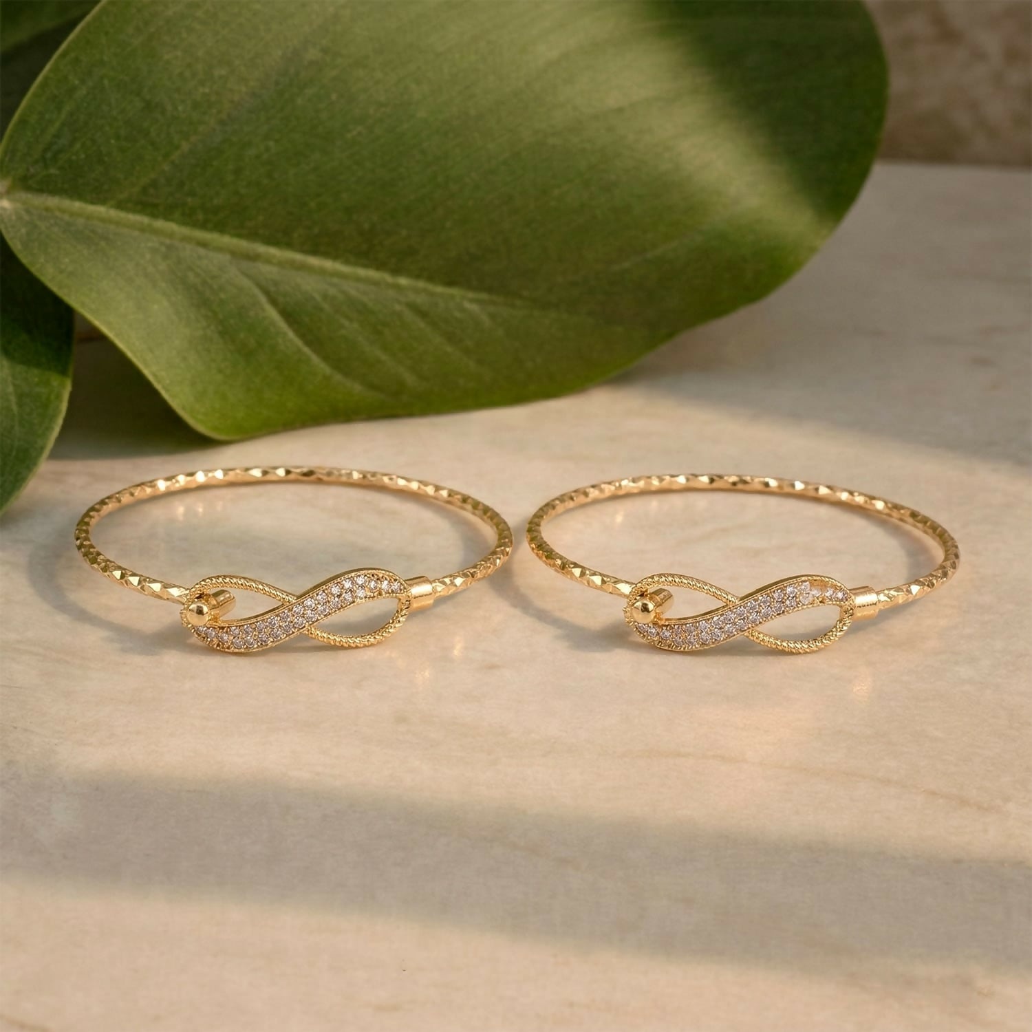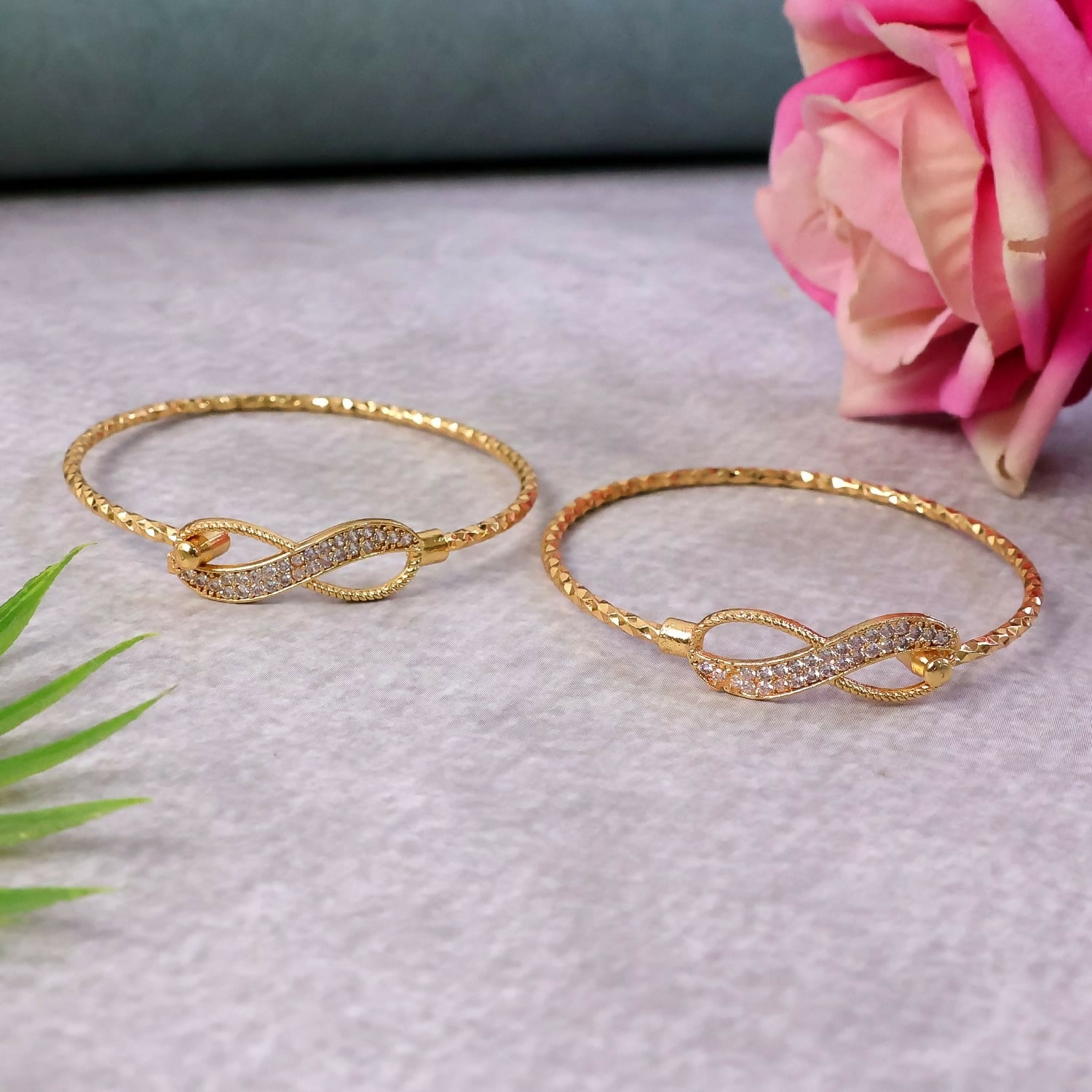 Elevate your style with this elegant gold plated infinity design kada bracelet pair. Featuring a beautifully crafted infinity motif adorned with sparkling stones, these bangles symbolize timeless elegance and everlasting style. The textured gold finish enhances the luxurious appeal, making them perfect for both traditional and modern outfits.
