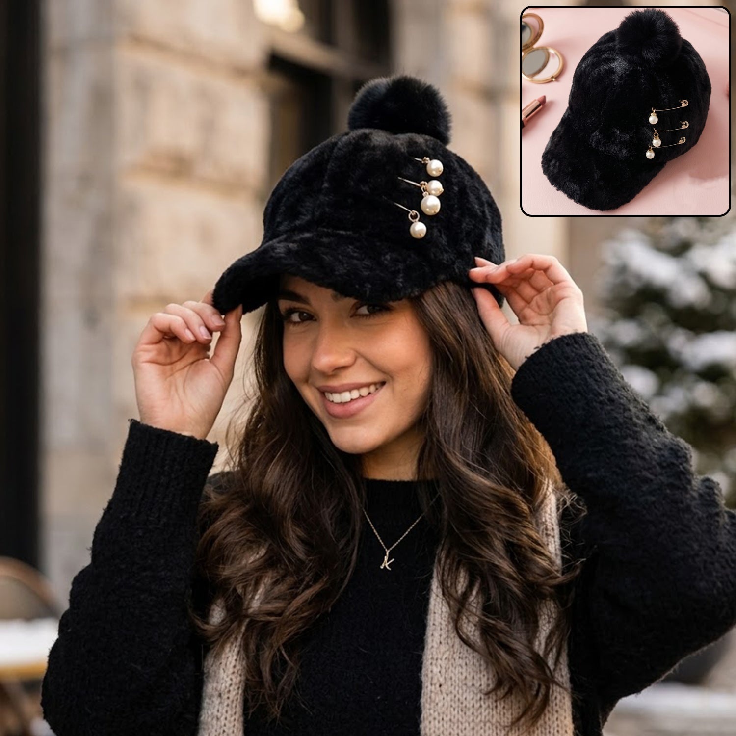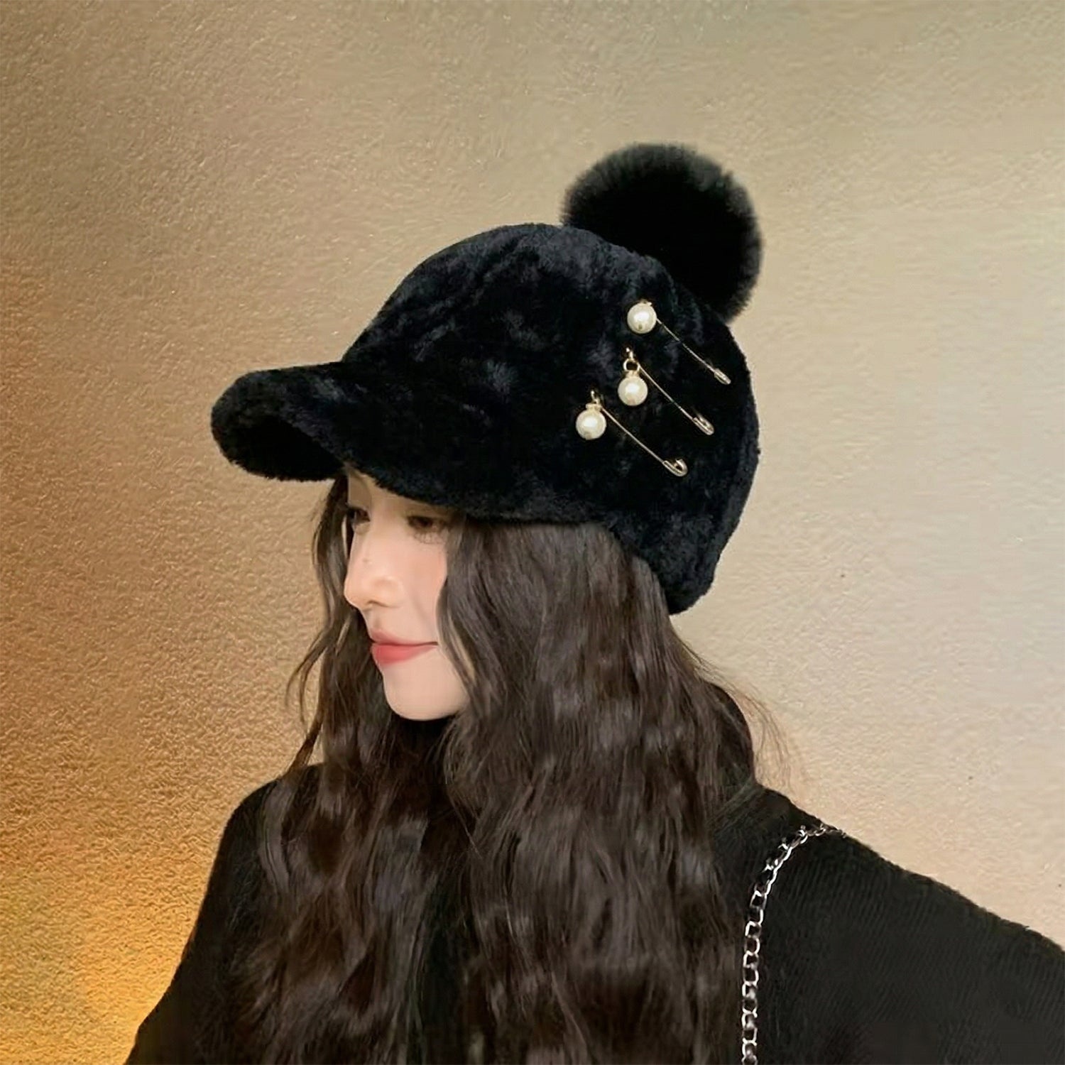 Elegant Winter Fur Cap for Women 1 Pc – Soft Plush Warm Cap with Pom Pom and Pearl Chain Decorative Design Stylish Cold Weather Fashion Headwear for Daily Wear & Outdoor Use