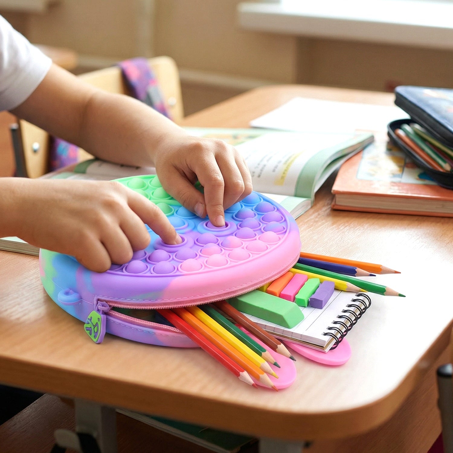 - Dual-purpose use as pencil pouch and fidget toy
