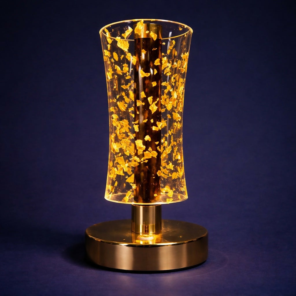 Add a touch of luxury to your space with this crystal glow LED table lamp. Featuring a stunning transparent shade with glowing crystal-like flakes and a premium gold base, this lamp creates a warm and mesmerizing ambiance. Perfect for bedrooms, living rooms, or work desks, it enhances both lighting and decor. Its modern design makes it an eye-catching centerpiece and a great gifting option.