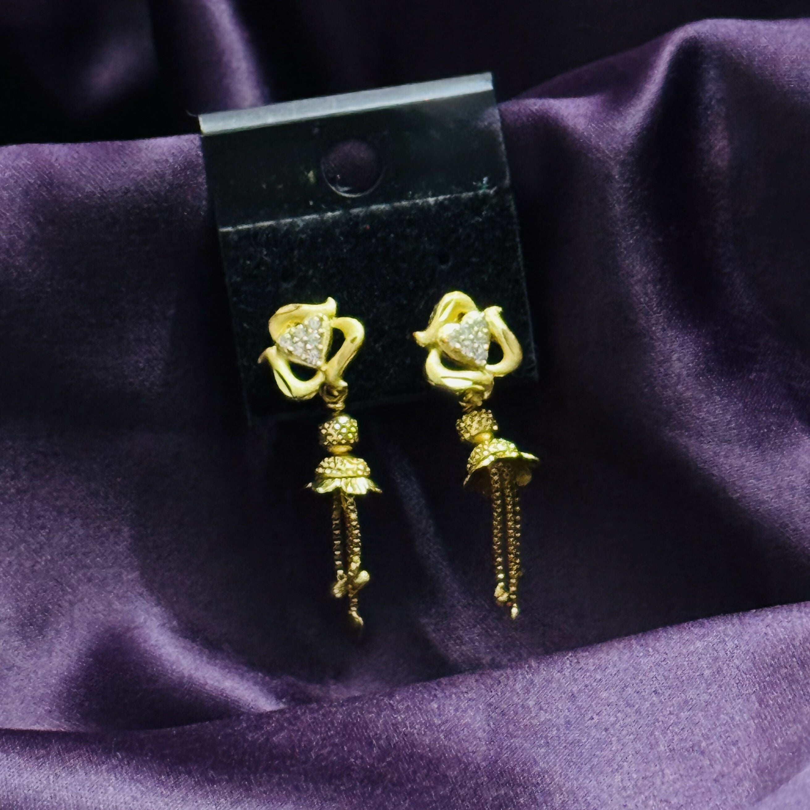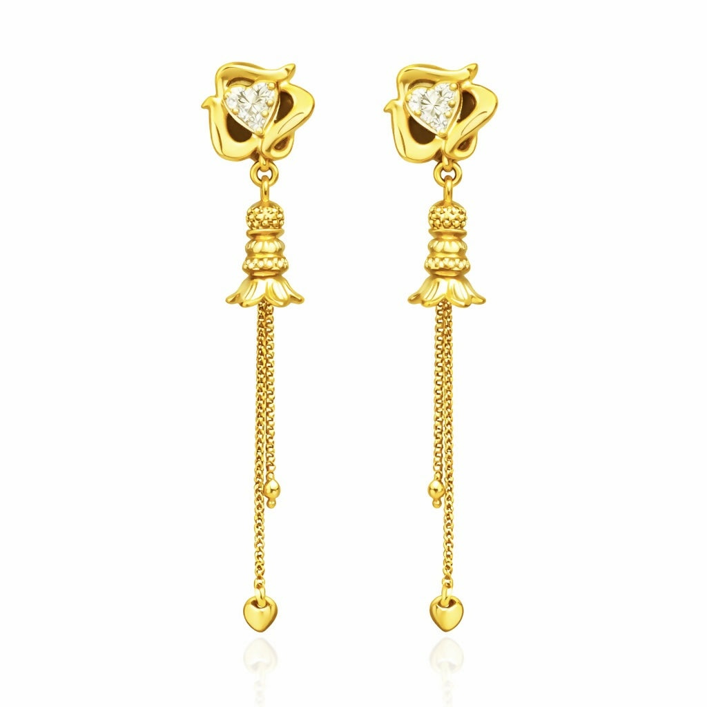 Elegant gold dangle earrings featuring a sparkling heart-shaped centerpiece with intricate detailing and delicate hanging chains, designed to add graceful movement and shine, perfect for both everyday wear and special occasions, with a lightweight feel, secure stud backing, and a versatile style that complements both traditional and modern outfits,These elegant gold dangle earrings are thoughtfully designed to offer a perfect blend of simplicity and sophistication, featuring a graceful teardrop-shaped top highlighted with a sparkling stone that adds a refined touch of brilliance; the smooth polished gold finish enhances their premium appeal, while the delicately crafted hanging elements create subtle movement and an eye-catching flow; lightweight and comfortable for all-day wear, they are secured with a sturdy stud backing to ensure a reliable fit; versatile in style, these earrings complement both traditional attire and modern outfits, making them ideal for festive occasions, parties, or everyday elegance, and a timeless addition to any jewelry collection.