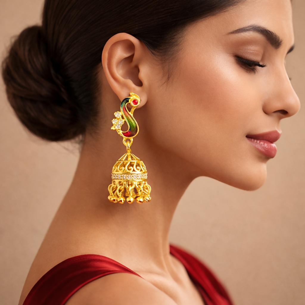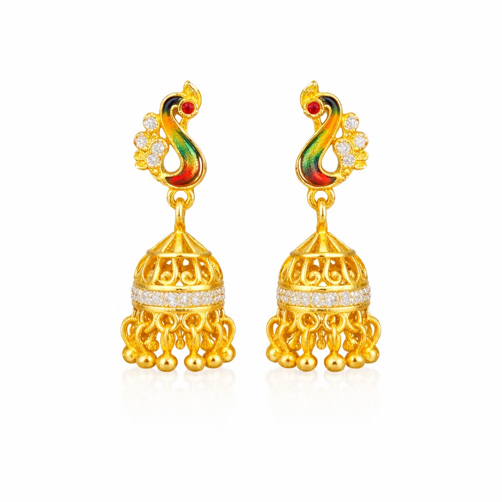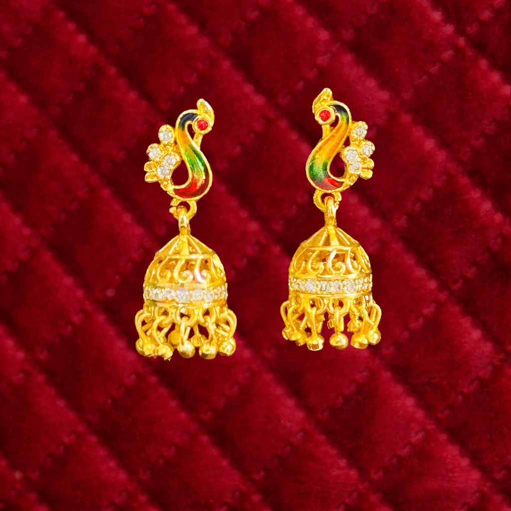 Add a touch of regal elegance to your look with these stunning peacock design gold jhumka earrings, beautifully crafted to reflect timeless tradition and intricate artistry. The upper portion showcases a gracefully curved peacock-inspired motif, adorned with vibrant enamel detailing in rich tones that enhance its eye-catching appeal. Accented with delicate shimmering stones, the design radiates a subtle brilliance, perfectly balancing color and shine. The earrings transition seamlessly into a classic jhumka dome, featuring finely carved patterns and a sparkling stone-studded band that adds depth and luxury to the overall piece. The bottom is finished with multiple dangling gold beads that sway gently with movement, creating a graceful and lively effect. Designed to be lightweight yet impactful, these earrings offer both comfort and statement style, making them ideal for weddings, festive occasions, traditional events, or special gatherings. Their versatile design pairs effortlessly with ethnic outfits like sarees, lehengas, and suits, while also complementing modern fusion wear. A perfect blend of heritage craftsmanship and contemporary charm, these earrings are a must-have for anyone who appreciates detailed design and elegant jewelry.