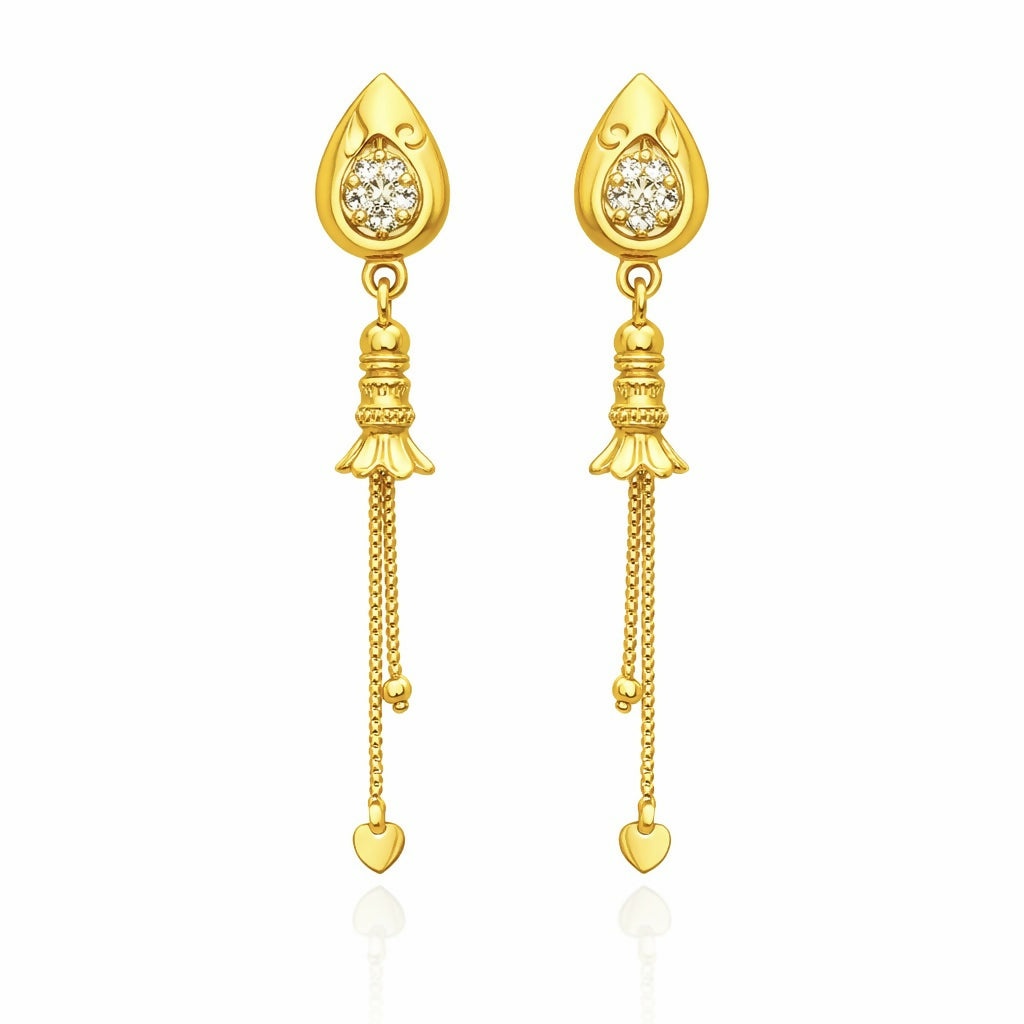 Elegant and timeless, these gold dangle earrings feature a refined teardrop-shaped top adorned with a sparkling stone at the center, creating a subtle yet eye-catching brilliance; the smooth polished gold finish enhances their luxurious appeal, while the intricately crafted hanging elements add graceful movement and delicate charm with every step; designed to be lightweight and comfortable, they are perfect for extended wear and secured with a sturdy stud backing for a reliable fit; the fine detailing and balanced design make these earrings versatile enough to complement both traditional attire like sarees and lehengas as well as modern outfits, making them an ideal choice for festive occasions, weddings, parties, or everyday elegance; a perfect blend of sophistication and craftsmanship, these earrings also make a thoughtful gift option, offering durability, style, and a classic aesthetic that never goes out of fashion.