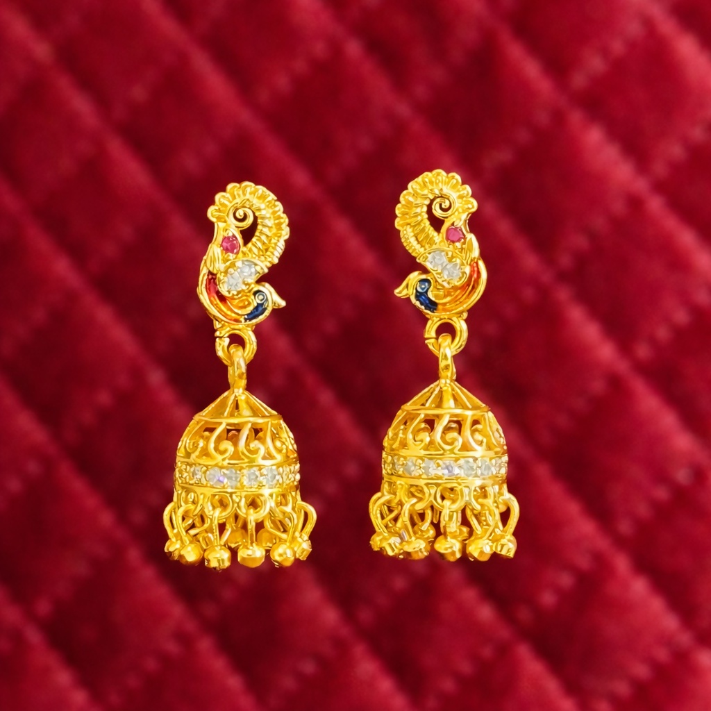 Turn every moment into a statement of elegance with these beautifully crafted gold jhumka earrings, designed to reflect timeless charm and cultural richness. The upper design features a graceful artistic motif with vibrant enamel accents that add a unique pop of color while perfectly complementing the rich gold finish. Subtle stone detailing enhances the design with a refined sparkle, giving it a luxurious yet balanced appeal. The earrings flow into a stunning bell-shaped jhumka with intricate openwork patterns that showcase fine craftsmanship and attention to detail. A shimmering band of stones wraps around the center, adding brilliance and contrast to the warm gold tones. The base is adorned with multiple gold bead danglers that create soft movement and a graceful rhythmic charm with every step. Lightweight and comfortable for long wear, these earrings are ideal for weddings, festive occasions, and traditional celebrations, pairing effortlessly with sarees, lehengas, salwar suits, and even modern fusion outfits. Combining classic inspiration with contemporary elegance, this pair is a perfect addition to any jewelry collection for those who appreciate detailed design and timeless beauty.