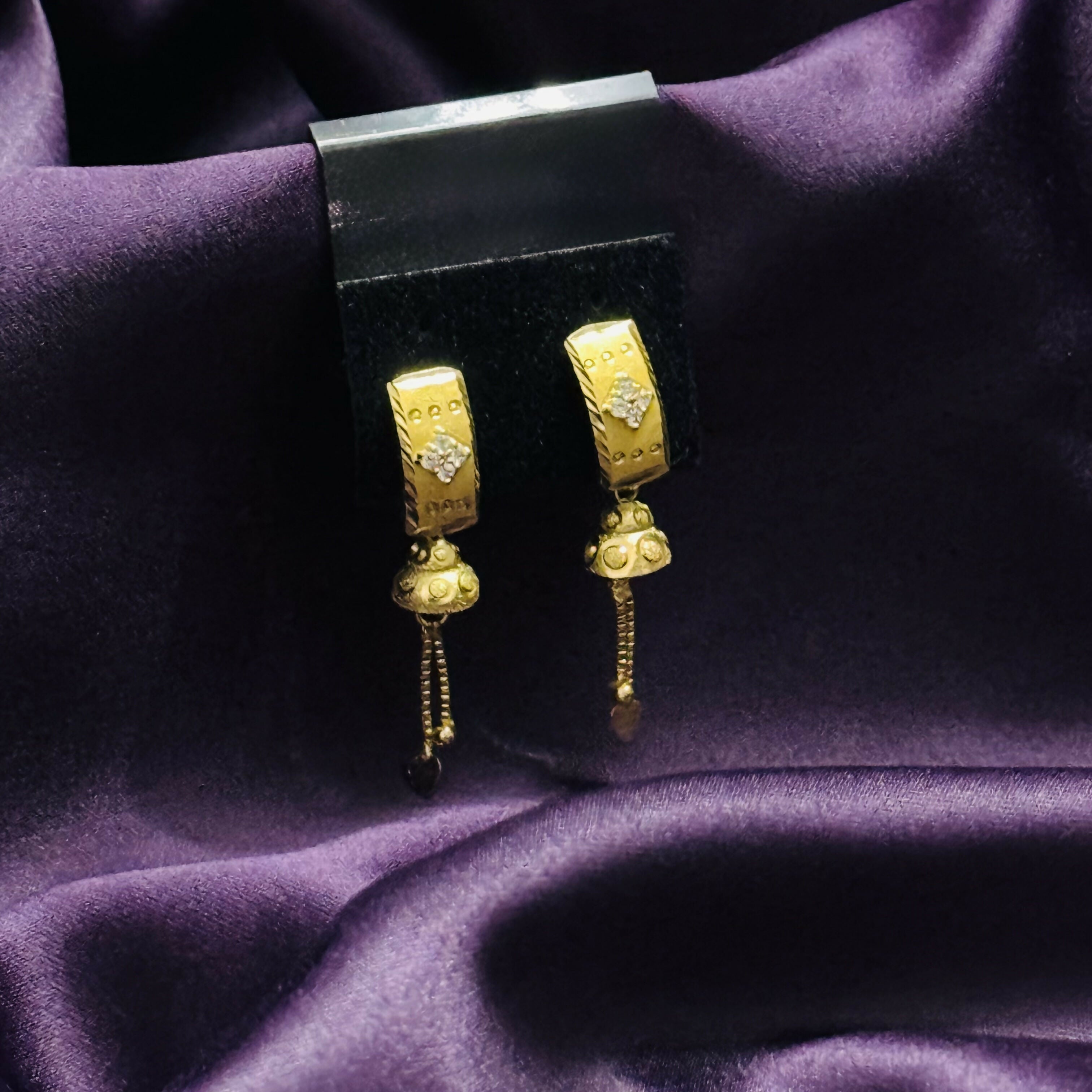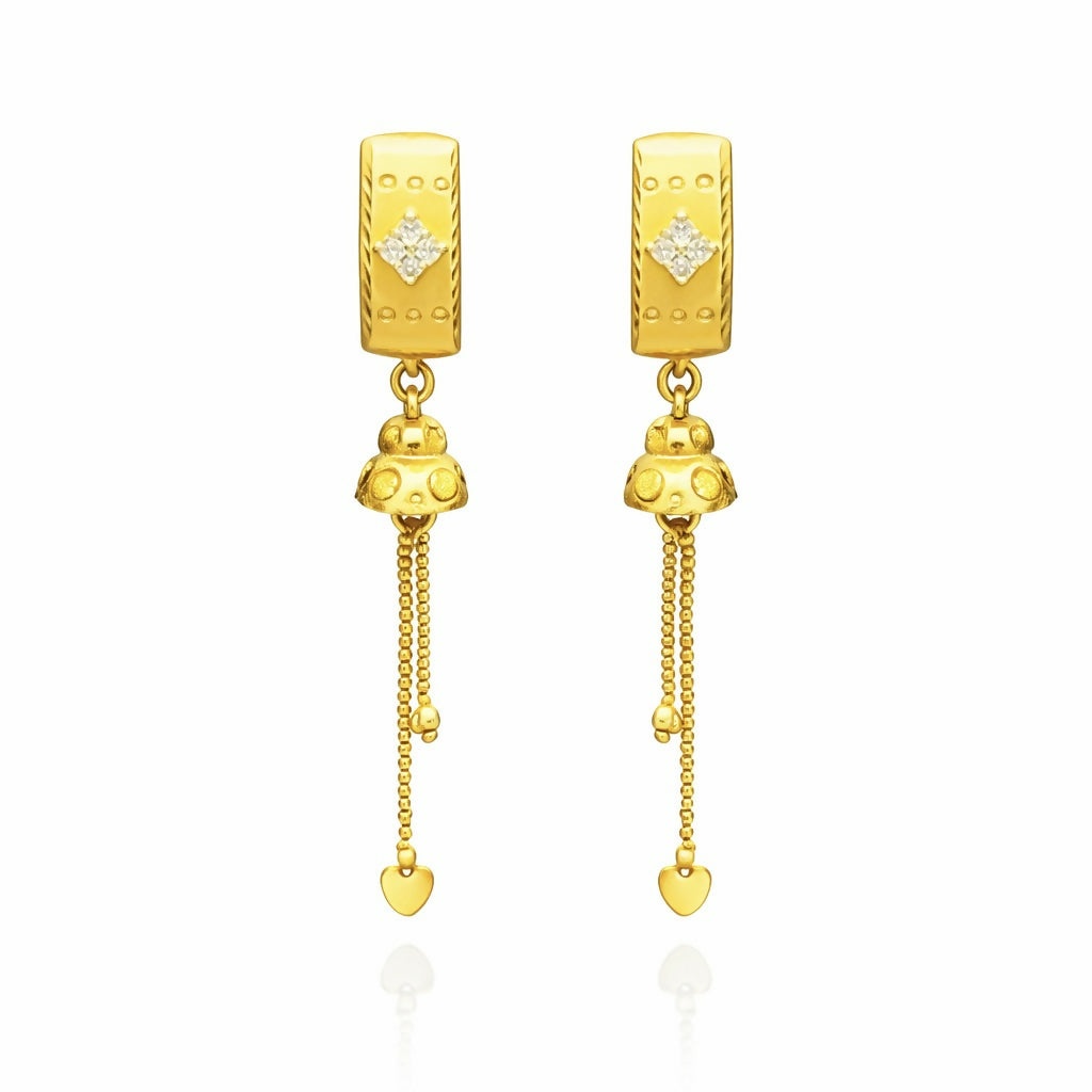 Gracefully designed with a classic appeal, these gold dangle earrings showcase a sleek teardrop-shaped top embellished with a shimmering stone that catches the light beautifully, complemented by finely detailed dangling elements that create soft movement and an elegant flow; crafted with a high-polish gold finish, they offer a rich and luxurious look while remaining lightweight and comfortable for all-day wear; the secure stud backing ensures a firm and easy fit, making them practical as well as stylish; perfect for enhancing both traditional and contemporary outfits, these earrings are ideal for festive celebrations, special occasions, or adding a touch of sophistication to everyday looks, making them a versatile and timeless addition to any jewelry collection.