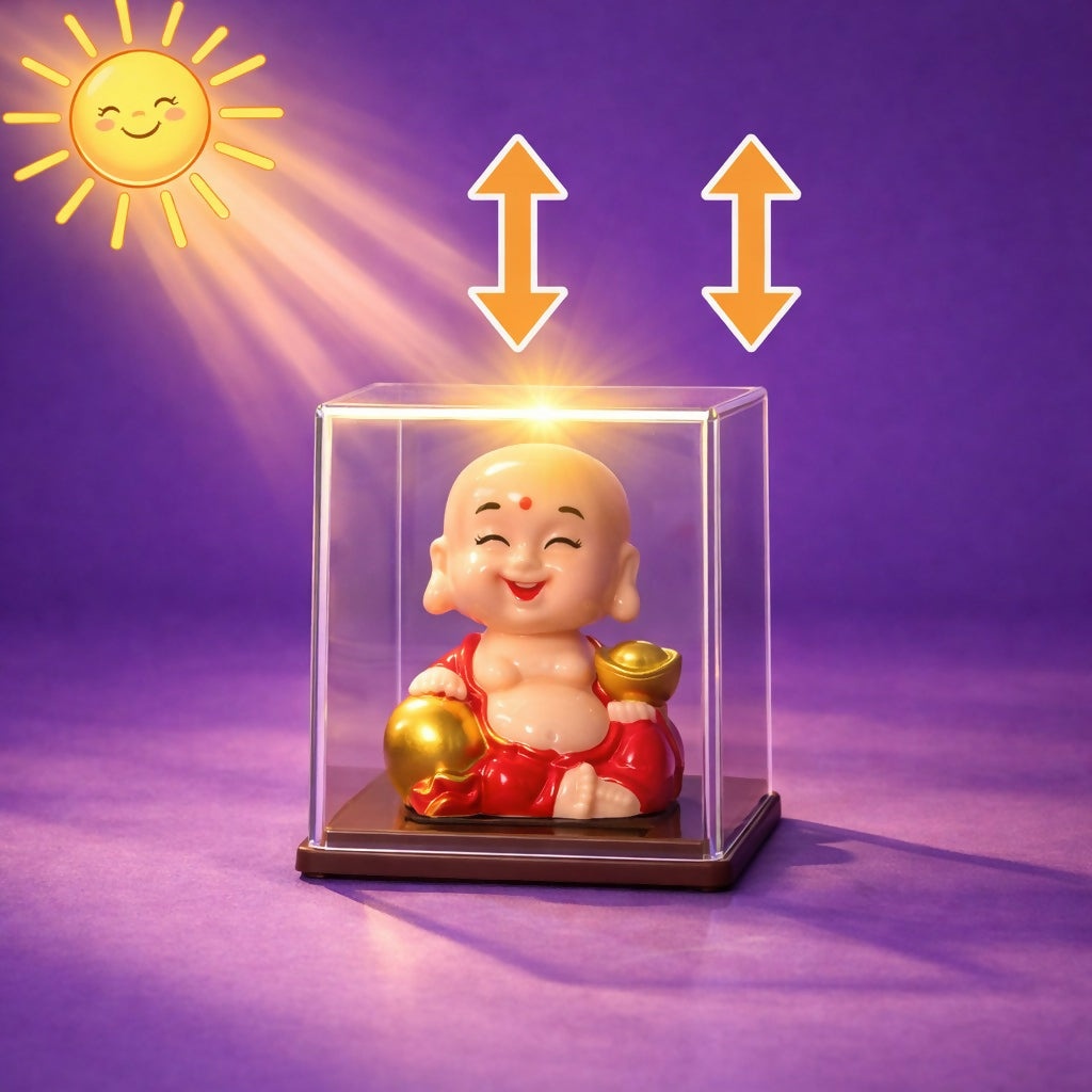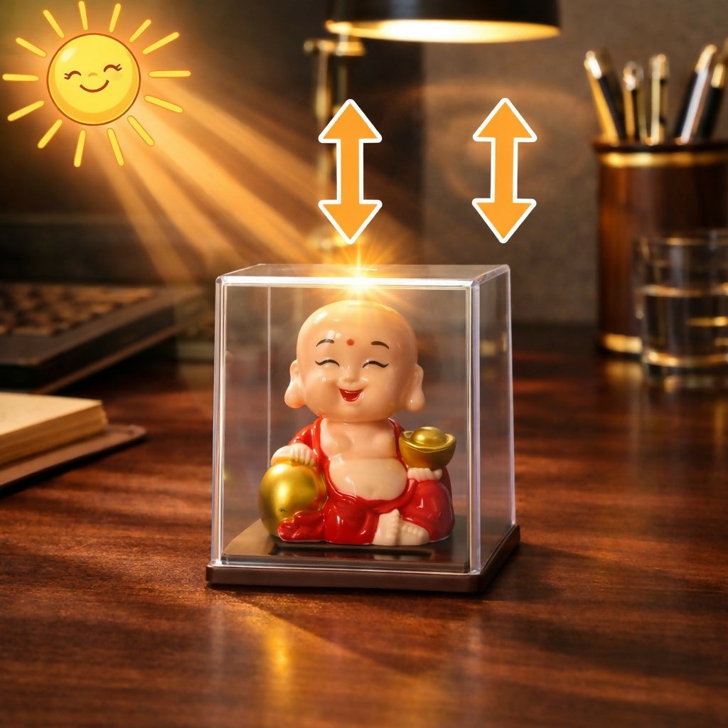 solar bobble head, laughing Buddha statue, moving head figurine, solar powered idol, desk decor item, car dashboard decoration, spiritual decor, decorative statue, gift item, bobble head toy