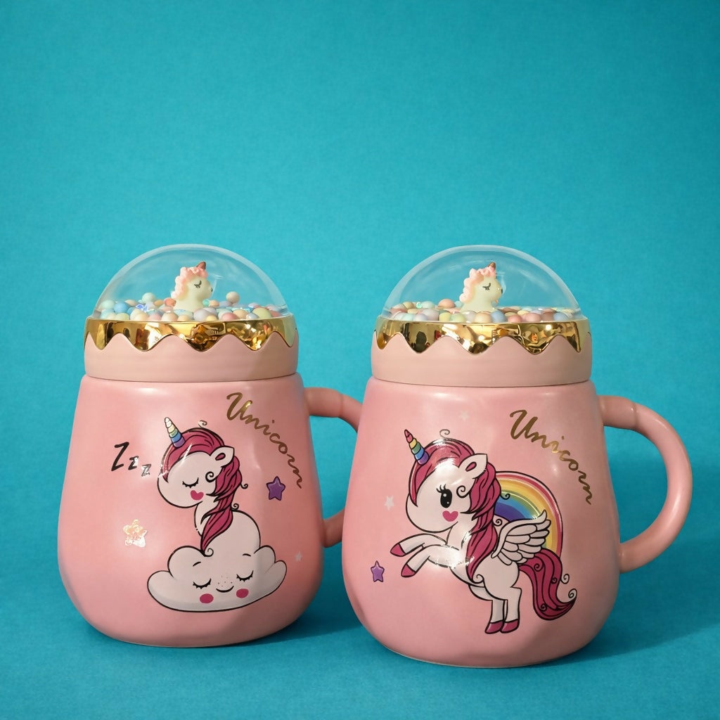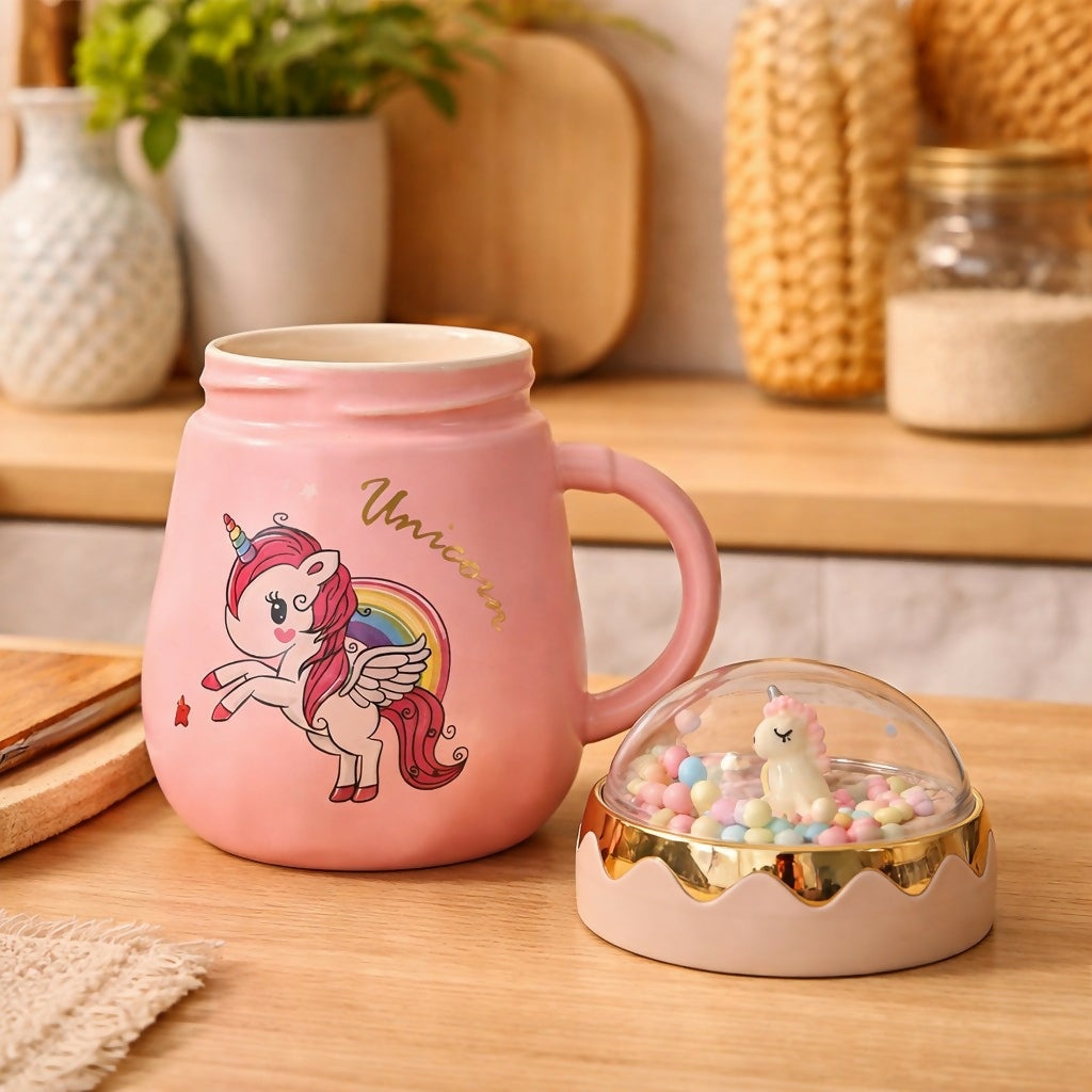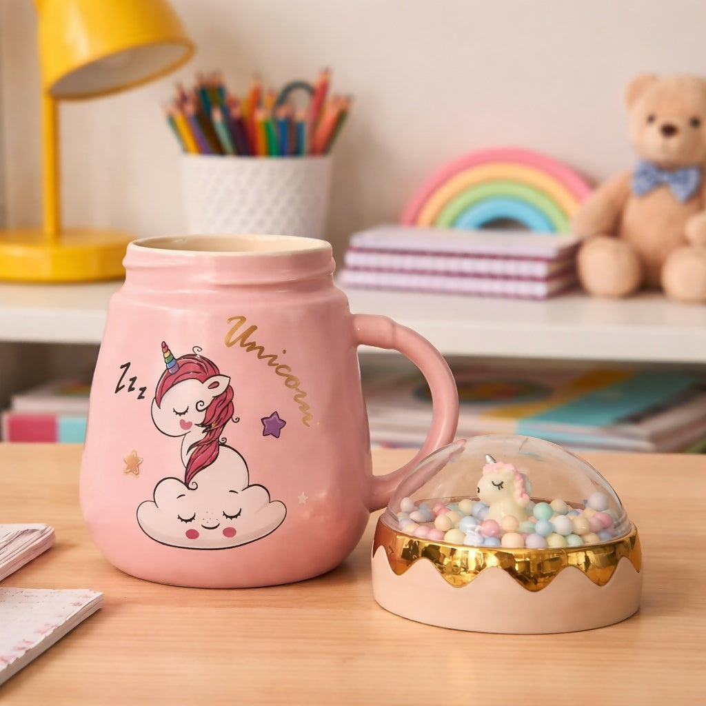 Add a magical touch to your daily routine with this adorable unicorn printed ceramic mug. Designed with a cute unicorn illustration and soft pastel finish, this mug comes with a decorative lid that helps retain warmth while enhancing its charm. Perfect for kids and unicorn lovers, it is ideal for enjoying milk, coffee, or hot chocolate. A delightful addition to any desk, study table, or kitchen, and a great gifting option for special occasions.