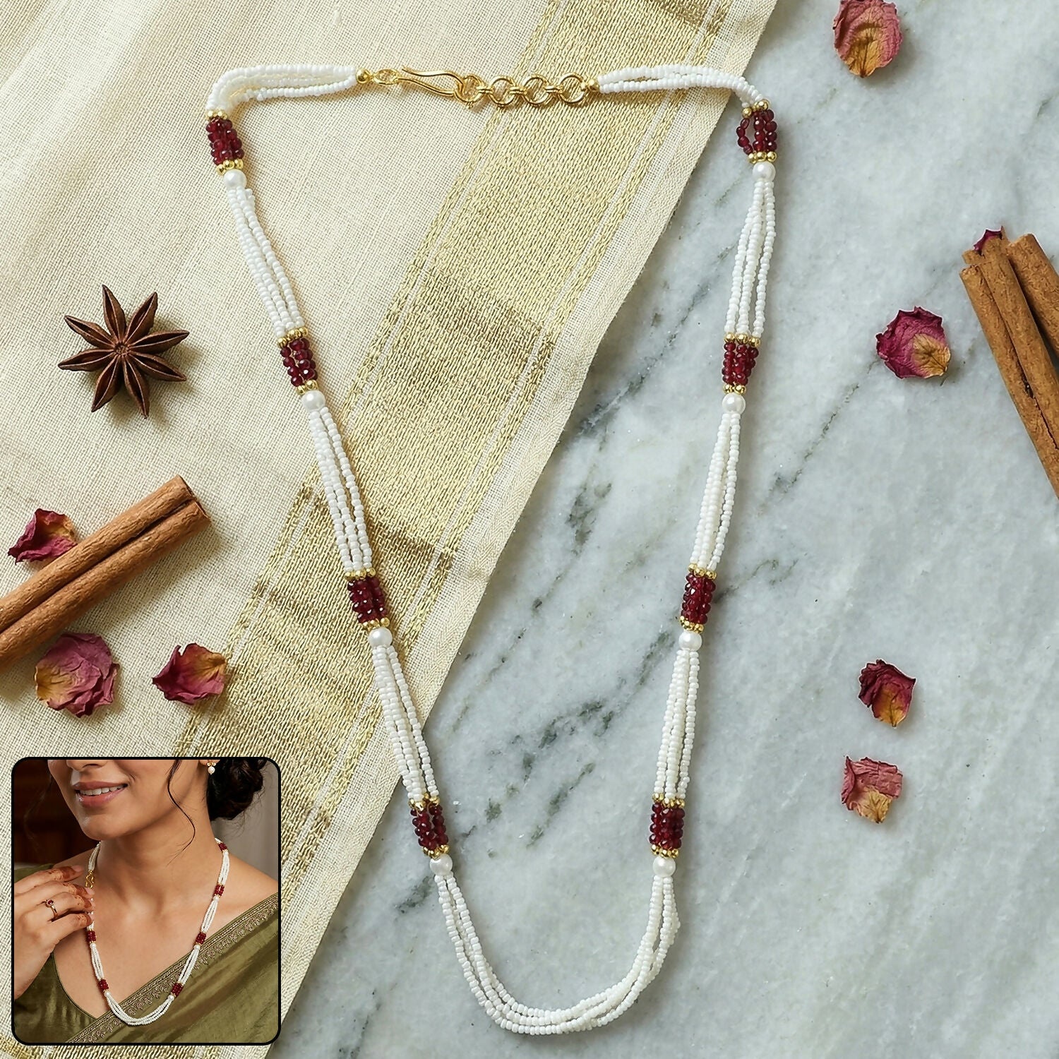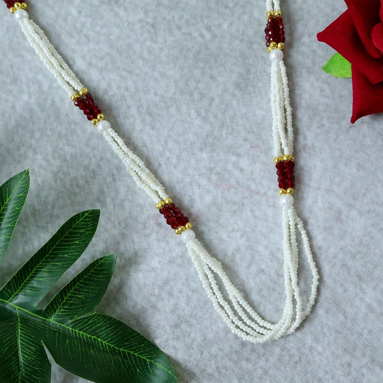 This elegant beaded pearl mala showcases a timeless traditional design with a refined modern touch. Featuring multiple strands of fine white beads paired with rich red accents and golden highlights, it creates a graceful and balanced look. The evenly spaced design gives it a clean and sophisticated appearance, making it perfect for festive wear, cultural occasions, and daily ethnic styling. Lightweight and comfortable, it sits beautifully on the neckline without feeling heavy. A versatile accessory that enhances sarees, kurtis, and traditional outfits effortlessly.