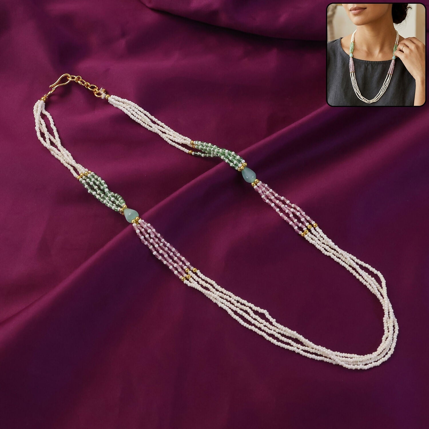 This graceful layered pearl mala necklace features delicate white pearl strands paired with soft pastel green and pink bead accents for a subtle yet elegant look. The multi-layered design at the bottom creates a beautiful flow, adding charm and sophistication. Handmade craftsmanship gives it a unique and refined finish. Ideal for daily wear, festive occasions, and ethnic outfits, it enhances your overall style effortlessly. Lightweight and comfortable, it is perfect for long wear with a classy appeal.