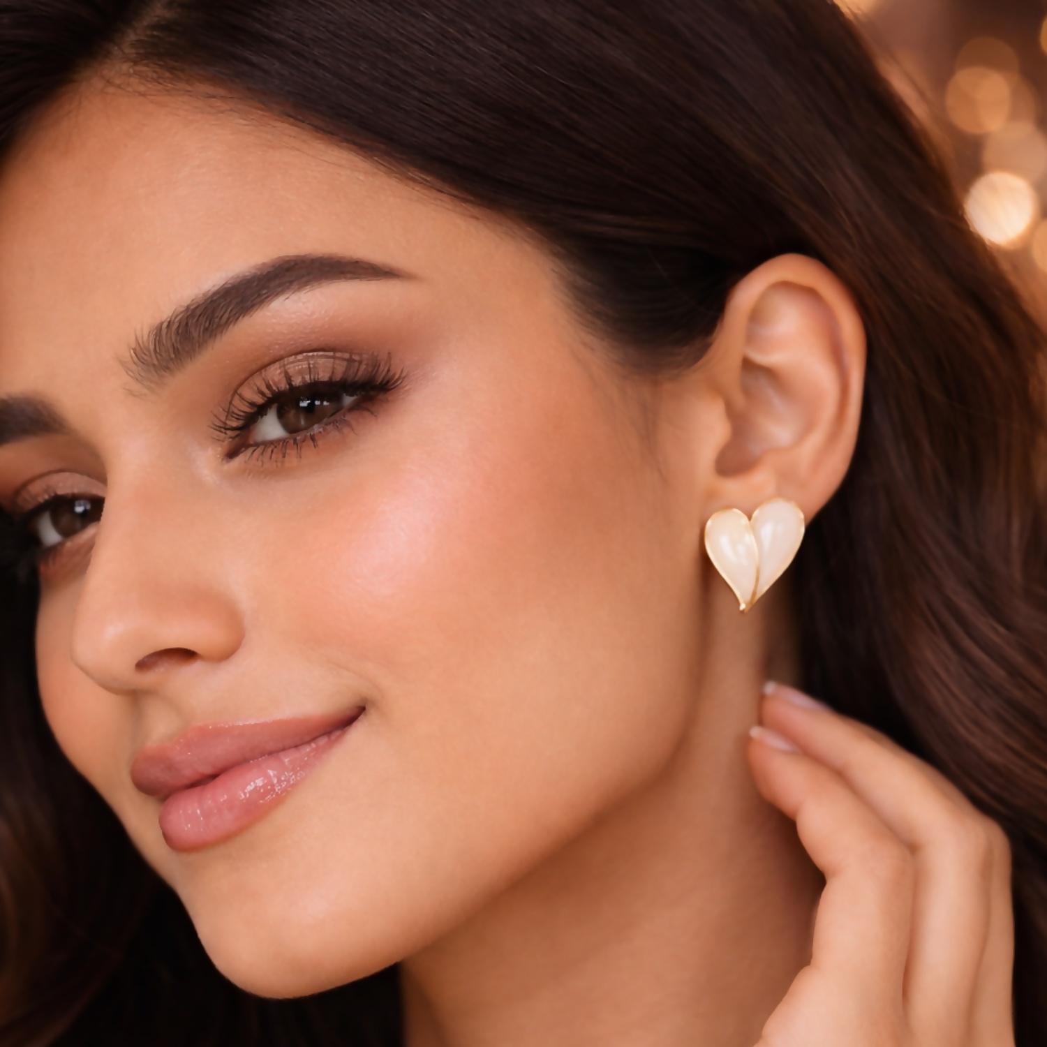 Add a touch of timeless elegance to your jewelry collection with these beautifully designed cream glossy leaf stud earrings. Crafted with a smooth, polished finish and highlighted by a premium gold-toned outline, these earrings bring a perfect balance of sophistication and modern style. The soft cream tone paired with the sleek leaf-inspired design creates a graceful and luxurious look that enhances any outfit effortlessly.