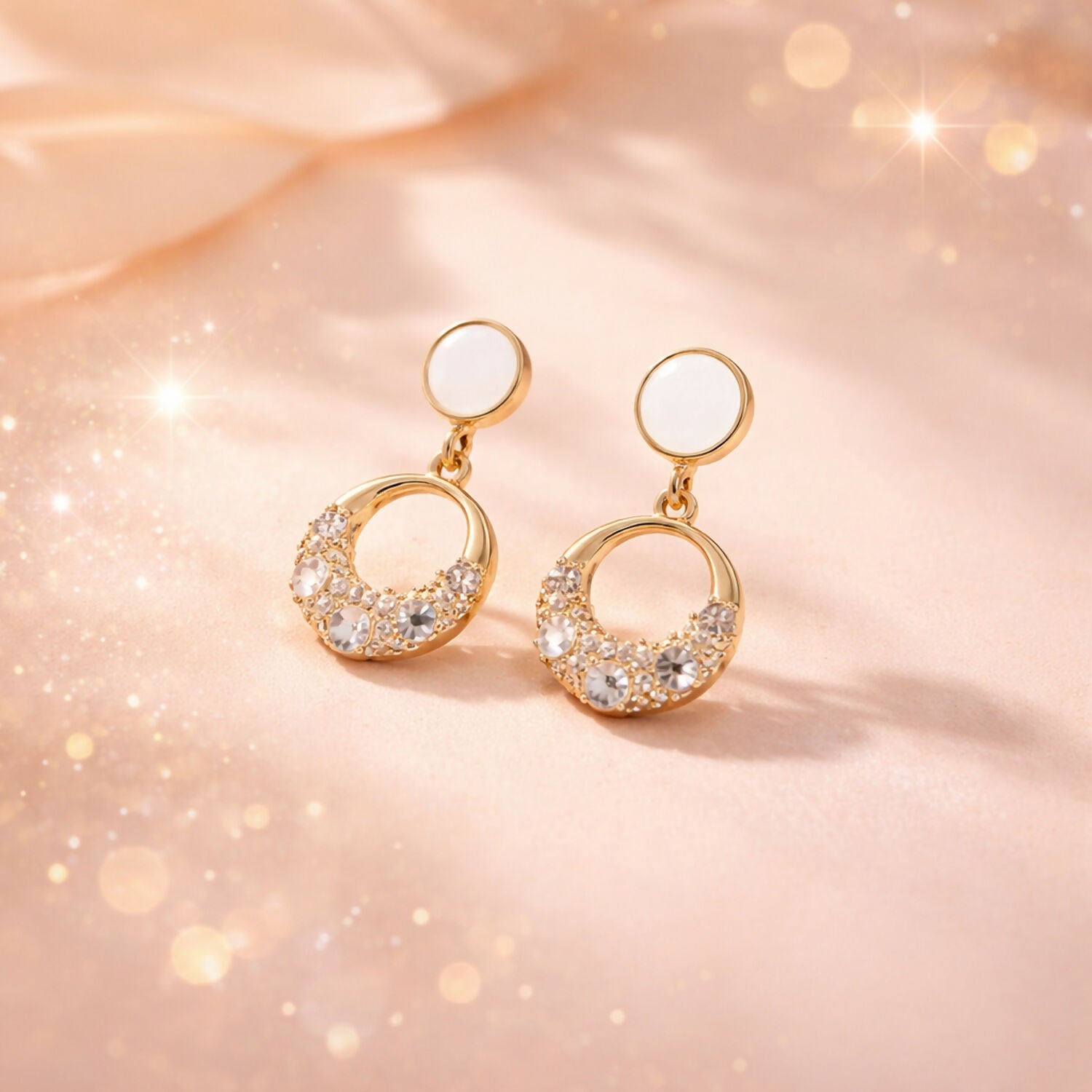 Elegant Gold Round Crystal Drop Earrings with Pearl Top Design for Women