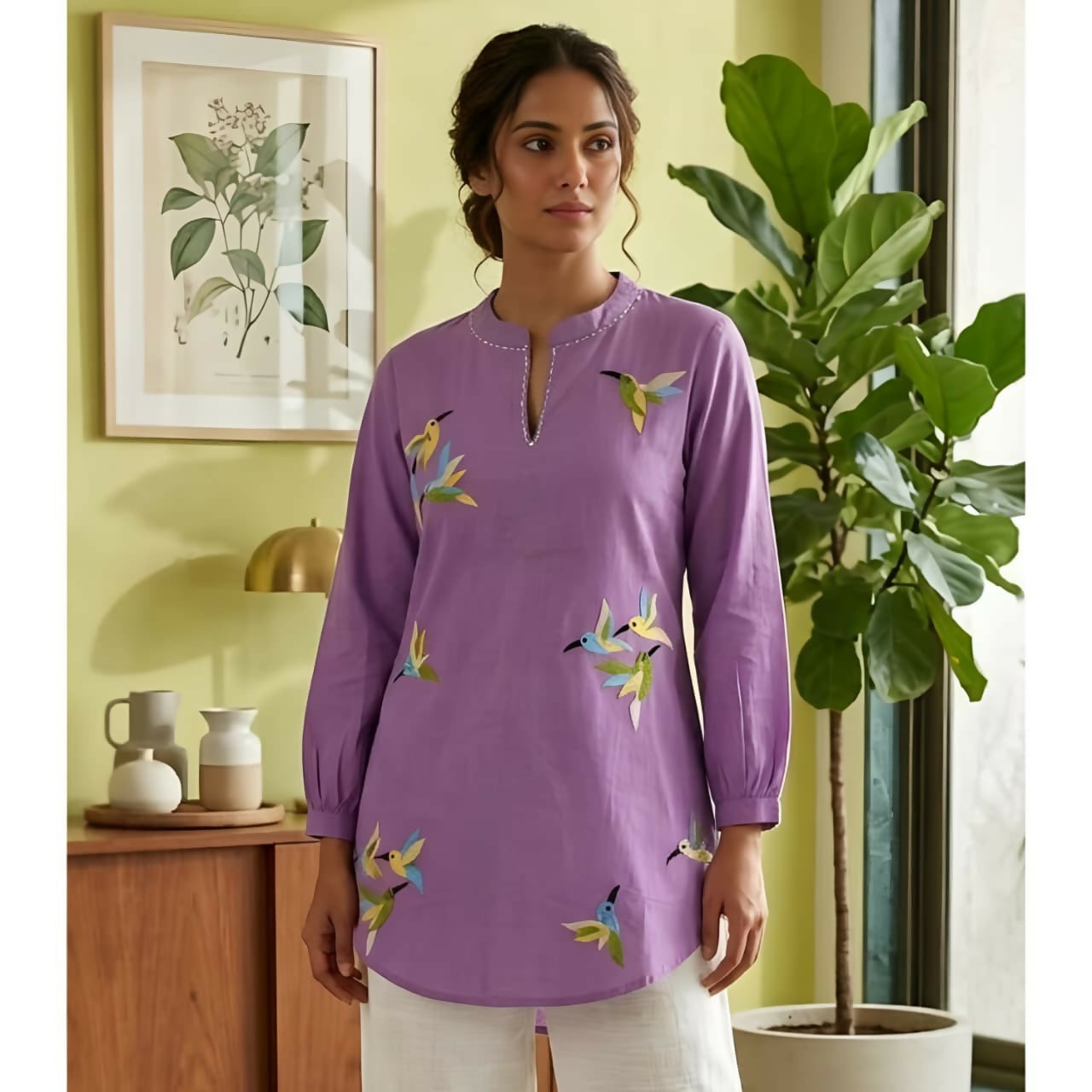 Elegant Purple Cotton Floral Top with Minimal Bird Embroidery