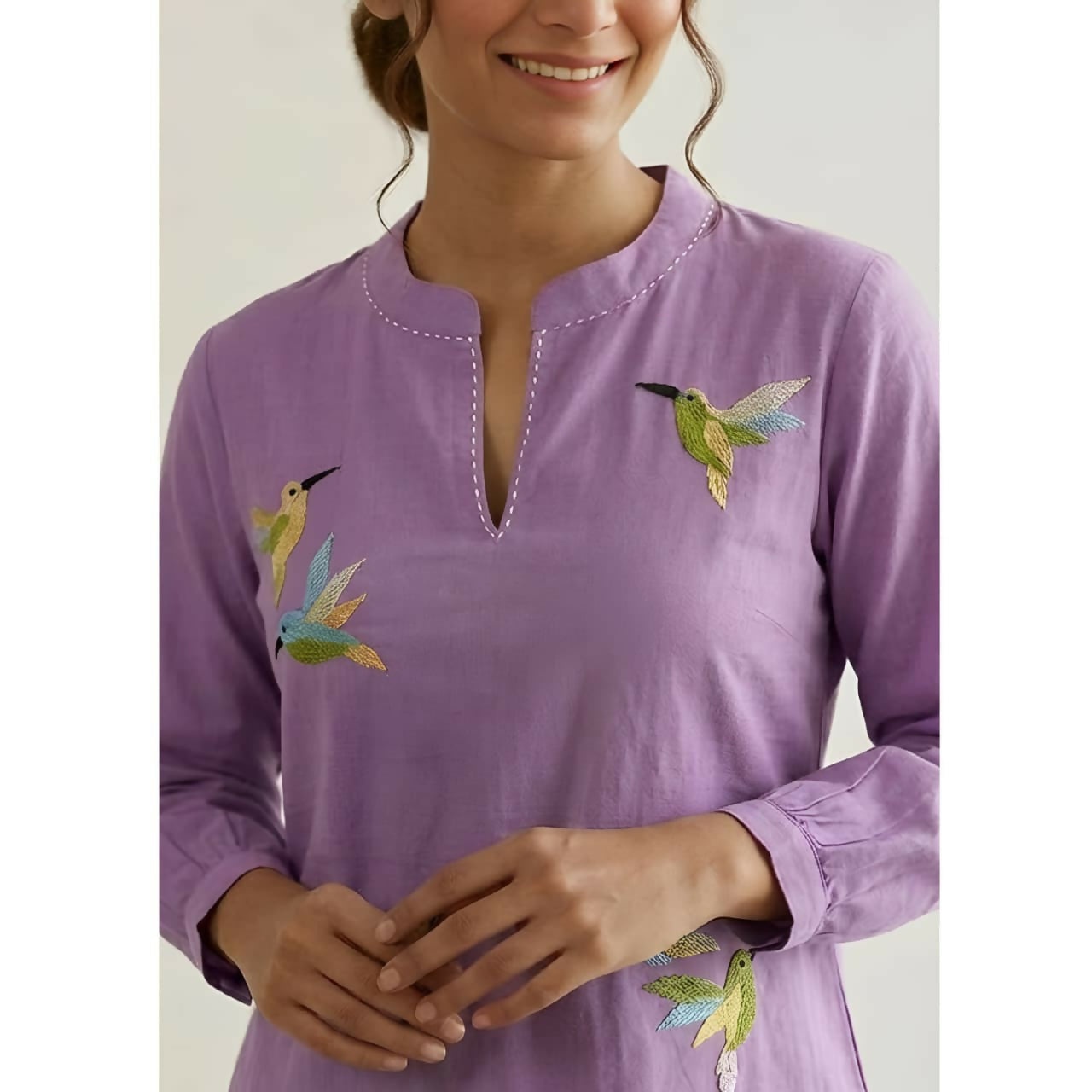 Elegant Purple Cotton Floral Top with Minimal Bird Embroidery