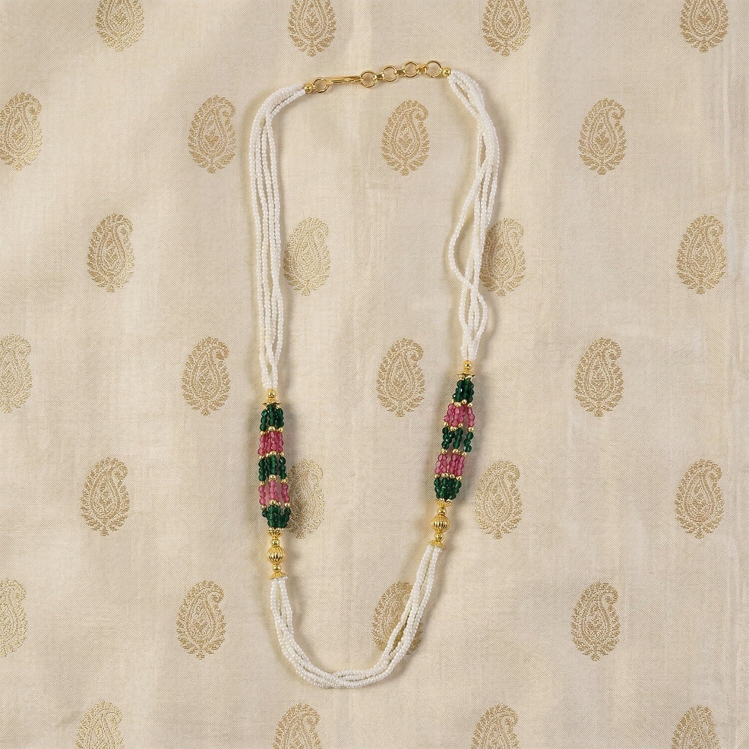 Enhance your ethnic look with this beautifully handcrafted white beaded mala necklace featuring a striking combination of green and pink traditional beadwork. Designed with fine detailing and multiple bead strands, this piece brings a graceful and timeless charm to any outfit. The handcrafted design adds uniqueness, making it stand out for festive occasions, cultural events, and daily traditional wear. Its lightweight structure ensures comfortable wear throughout the day while maintaining a rich and elegant appearance. A perfect choice for those who appreciate handmade jewelry with classic traditional aesthetics.