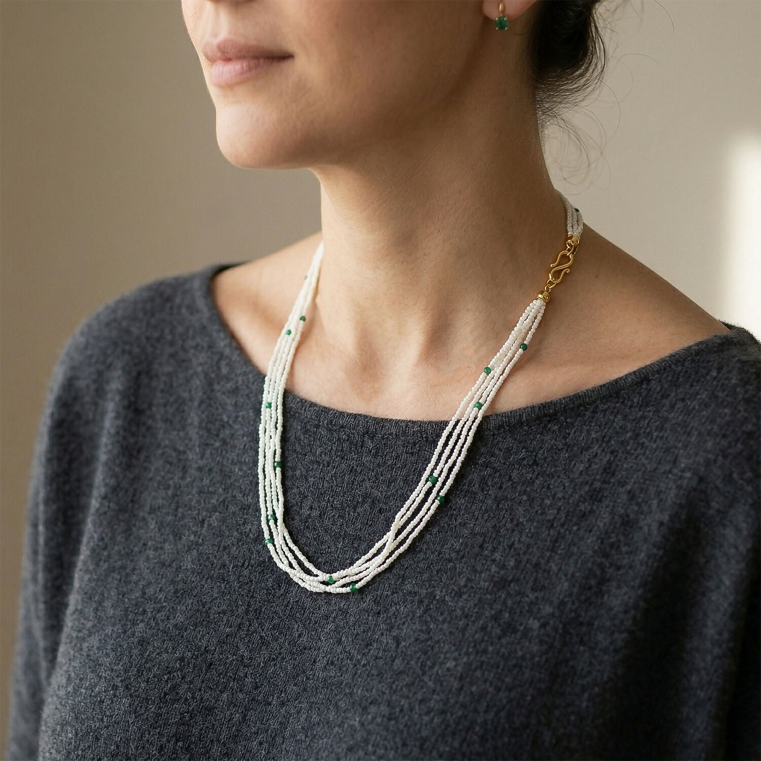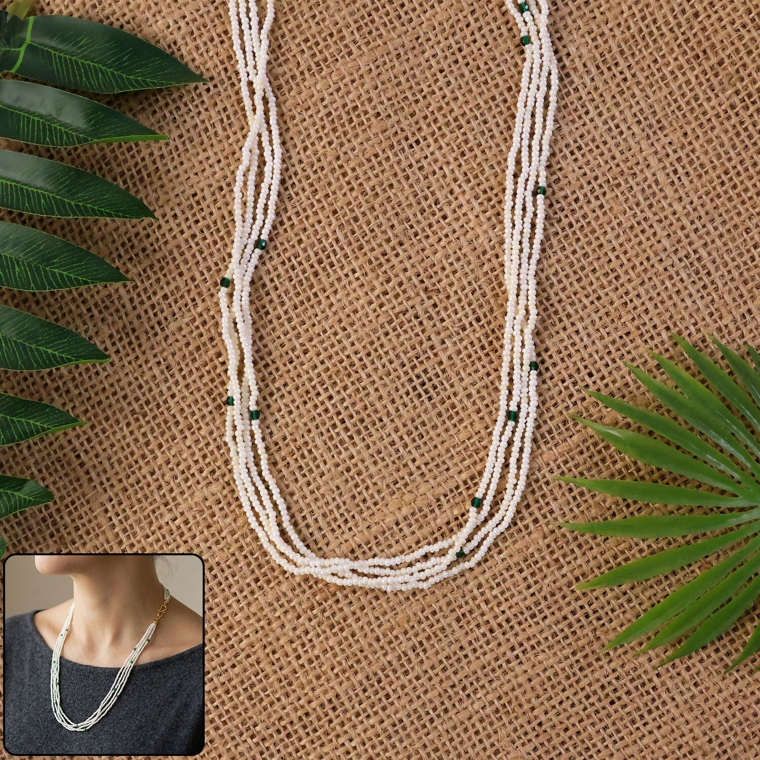 Enhance your traditional and modern look with this elegant multi-layer beaded mala designed with delicate white beads and subtle green accents. The layered mala design gives a graceful and sophisticated appearance, making it perfect for festive wear, daily styling, or office outfits. Its minimal yet stylish look pairs beautifully with both ethnic and contemporary attire. Lightweight and comfortable, this mala can be worn all day without any discomfort. A perfect gifting choice for girls and women who love simple, classy, and timeless jewelry pieces.