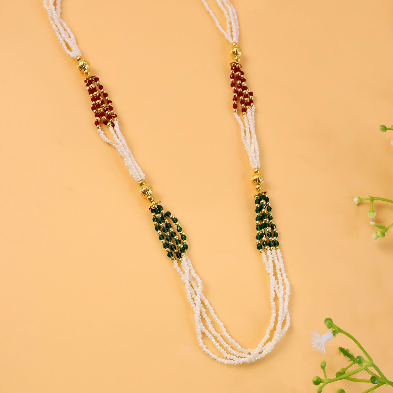 Enhance your ethnic look with this beautifully crafted multi-strand mala necklace featuring classic white beads paired with rich red and green accents. The layered design creates a graceful drape around the neckline, adding elegance and depth to your overall appearance. Designed with intricate detailing and a refined handmade finish, this necklace reflects timeless traditional aesthetics. The combination of vibrant accent beads and soft white strands makes it perfect for festive wear as well as special occasions. A versatile piece that effortlessly complements sarees, lehengas, and ethnic outfits.