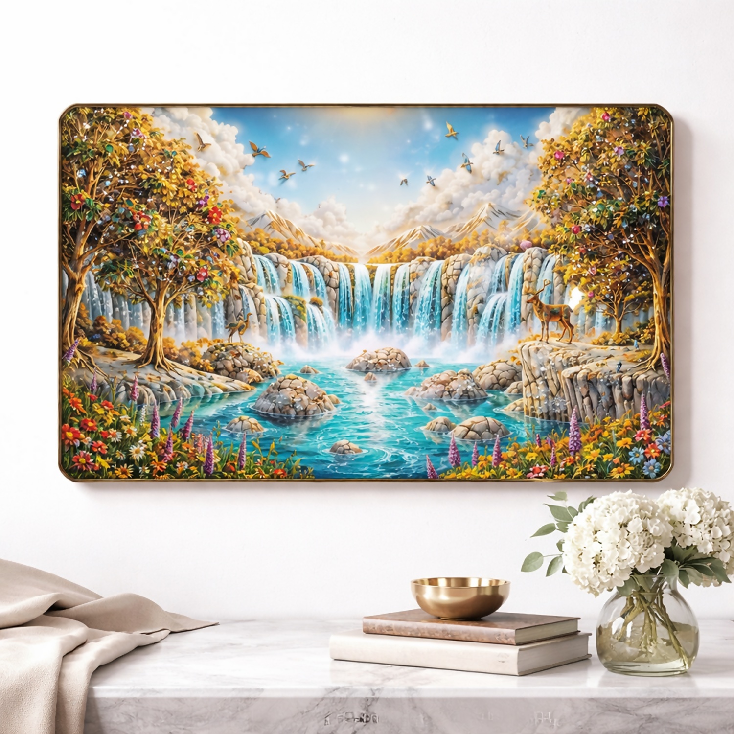 - Nature-Inspired Artwork: Waterfall, mountains, trees & wildlife theme