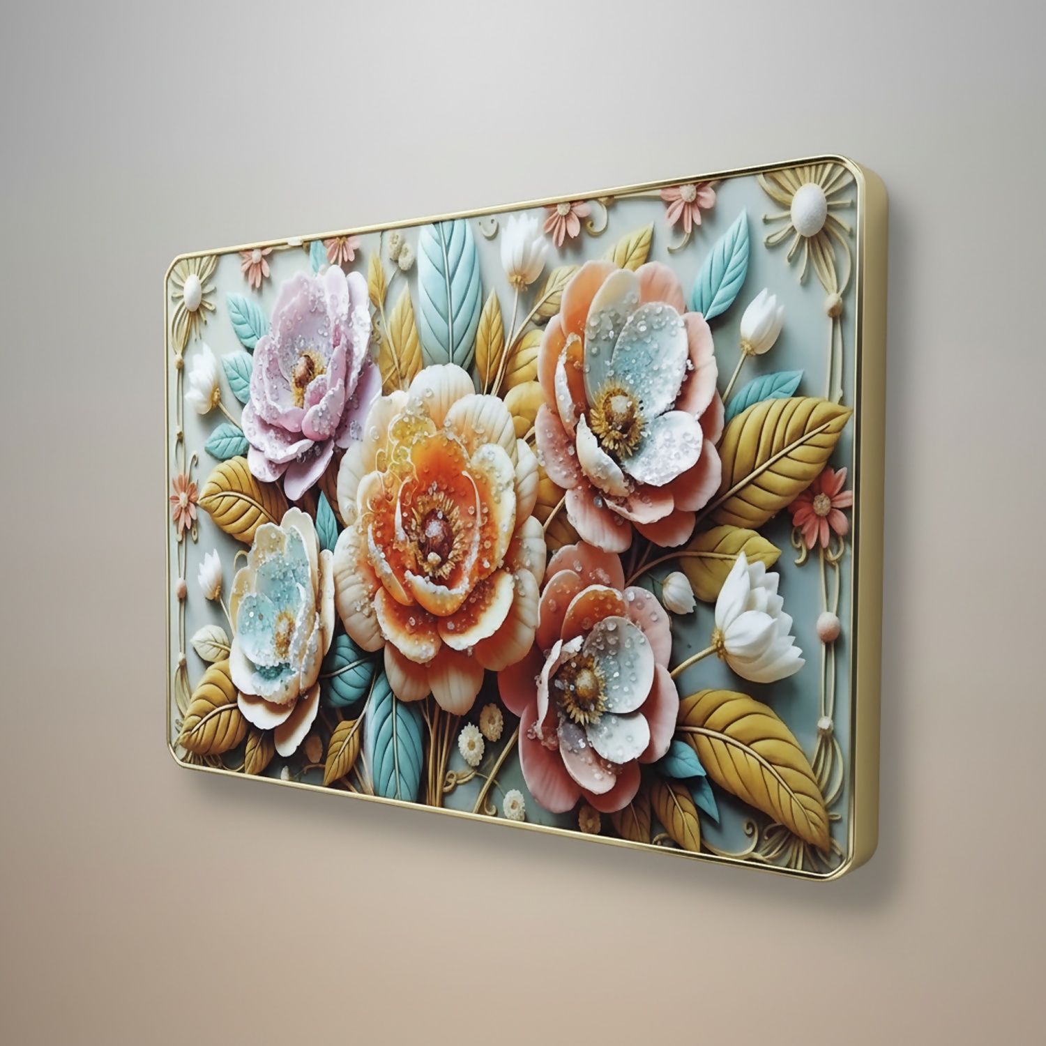 Premium 3D Floral Wall Art Panel – Luxury Golden Frame Home Decor