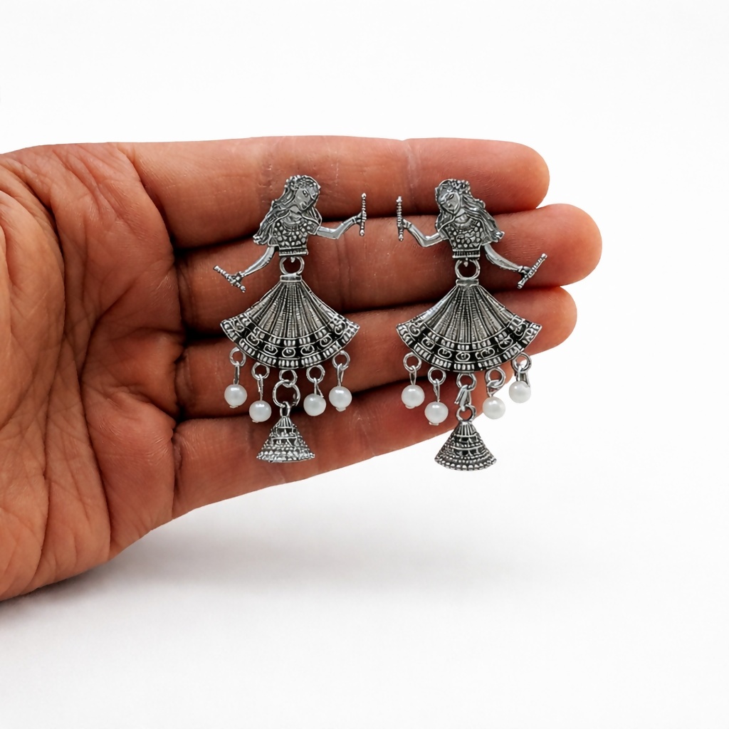 These elegant oxidised silver–finish earrings are inspired by traditional Indian folk art. Featuring a beautifully detailed tribal dancing girl design with jhumka danglers and pearl bead drops, these earrings add a rich ethnic charm to any outfit. The antique finish gives a classic handcrafted look, making them perfect for festive and cultural occasions.