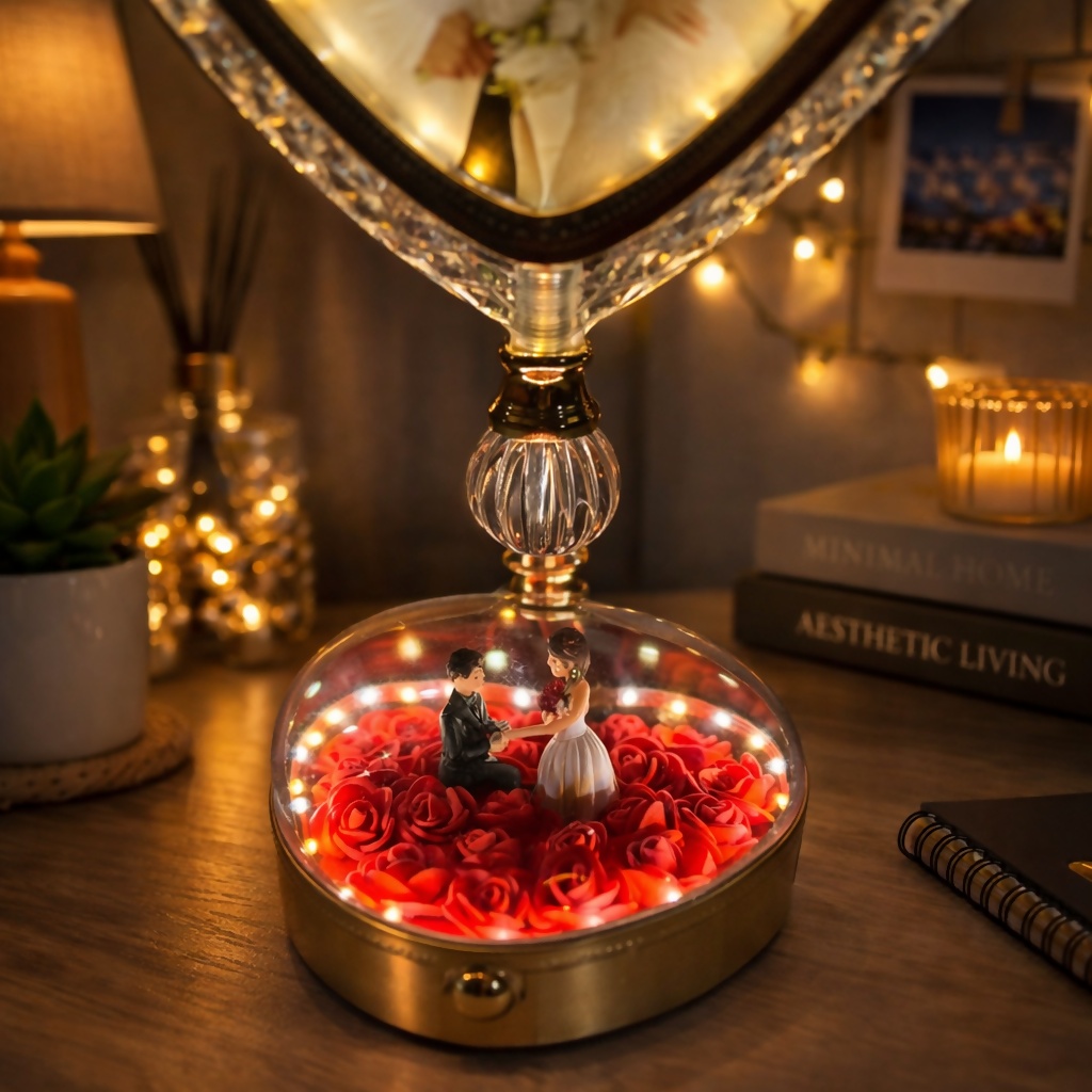 heart photo frame lamp, LED photo lamp, rose dome lamp, romantic table lamp, couple gift lamp, bedroom decor light, decorative night lamp, anniversary gift, wedding gift, LED heart frame, home decor lighting, photo display lamp