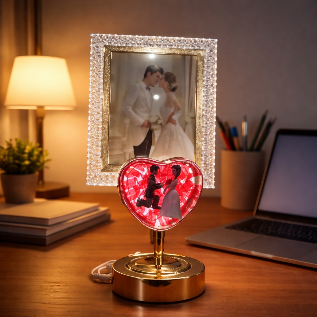 Enhance your home decor with this beautifully designed LED photo frame lamp featuring a romantic heart-shaped design. The upper frame holds your cherished photo, while the lower heart showcases a charming couple figurine, creating a perfect blend of emotion and elegance. The warm LED lighting adds a cozy ambiance, making it ideal for bedrooms, desks, or gifting purposes. Crafted with a stylish stand and crystal-like detailing, this decorative piece is perfect for special occasions like anniversaries, weddings, and birthdays.