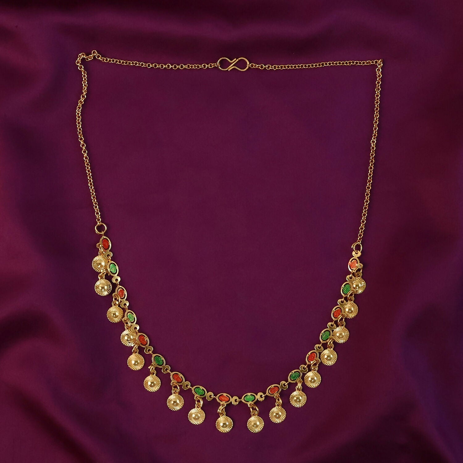 Add a touch of traditional elegance to your look with this beautifully crafted gold charm necklace. Designed with delicate dangling coin charms and vibrant multicolor stone accents, this piece reflects timeless ethnic beauty. The lightweight chain ensures comfortable wear, while the intricate detailing makes it perfect for festive occasions, weddings, or cultural celebrations. Pair it with ethnic or fusion outfits to create a graceful and eye-catching statement.
