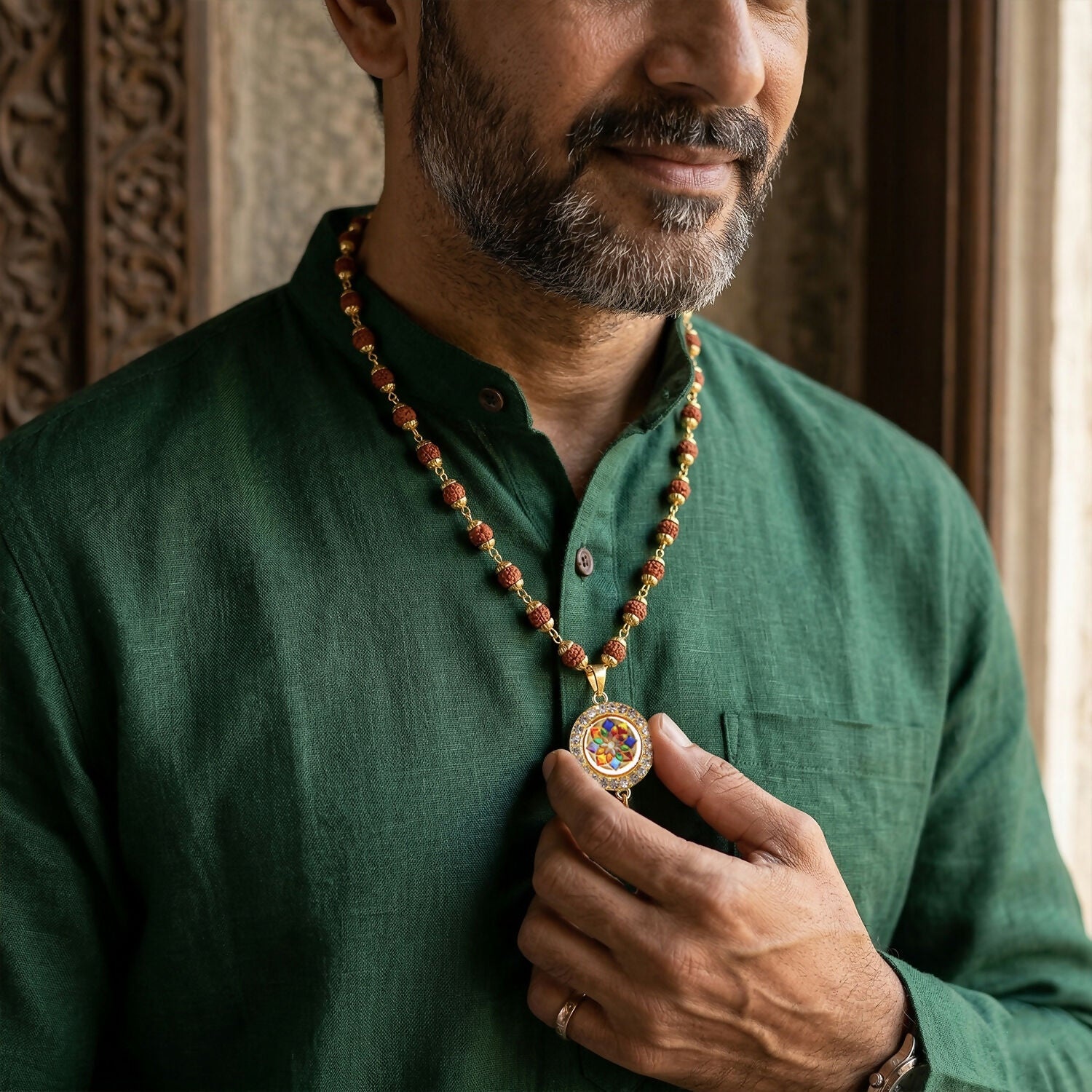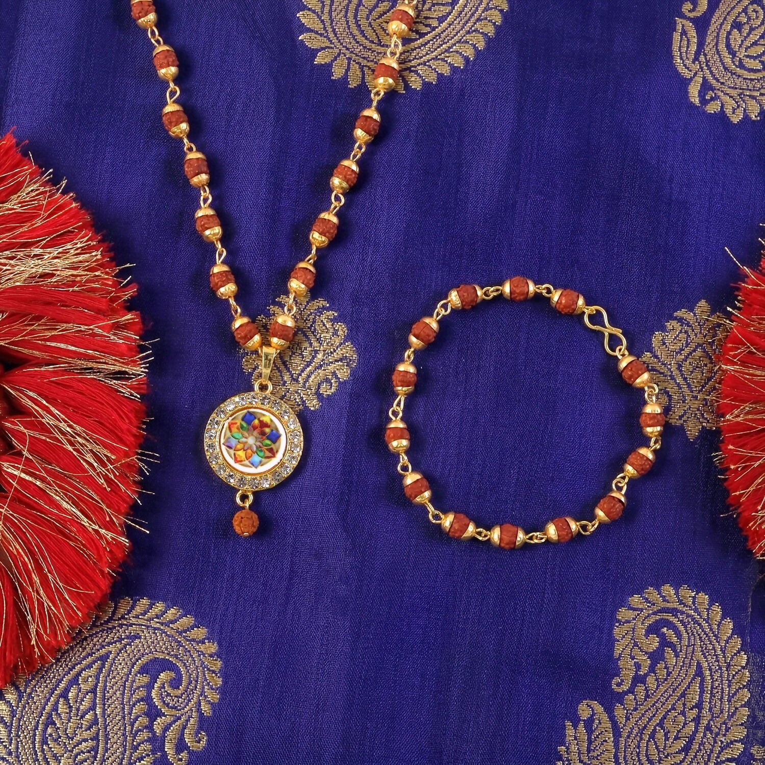 Embrace tradition and elegance with this beautifully crafted Rudraksha bead jewelry set. Featuring a matching necklace and bracelet, each piece is adorned with natural-style beads and gold-tone accents for a classic look. The necklace is highlighted by a decorative pendant with intricate detailing and a vibrant center design, adding a touch of charm and spirituality. Perfect for festive occasions, cultural wear, or everyday styling, this set makes a meaningful gift and a timeless addition to any jewelry collection.