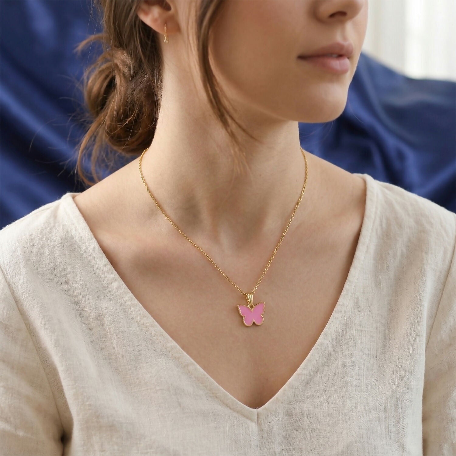 Add a delicate and feminine touch to your jewelry collection with this beautiful butterfly pendant necklace. Featuring soft pastel enamel shades outlined in a sleek gold finish, this piece offers a minimal yet stylish look. The lightweight chain makes it perfect for daily wear, while the charming butterfly design adds a graceful and trendy vibe. Ideal for casual outfits, gifting, or layering with other jewelry.