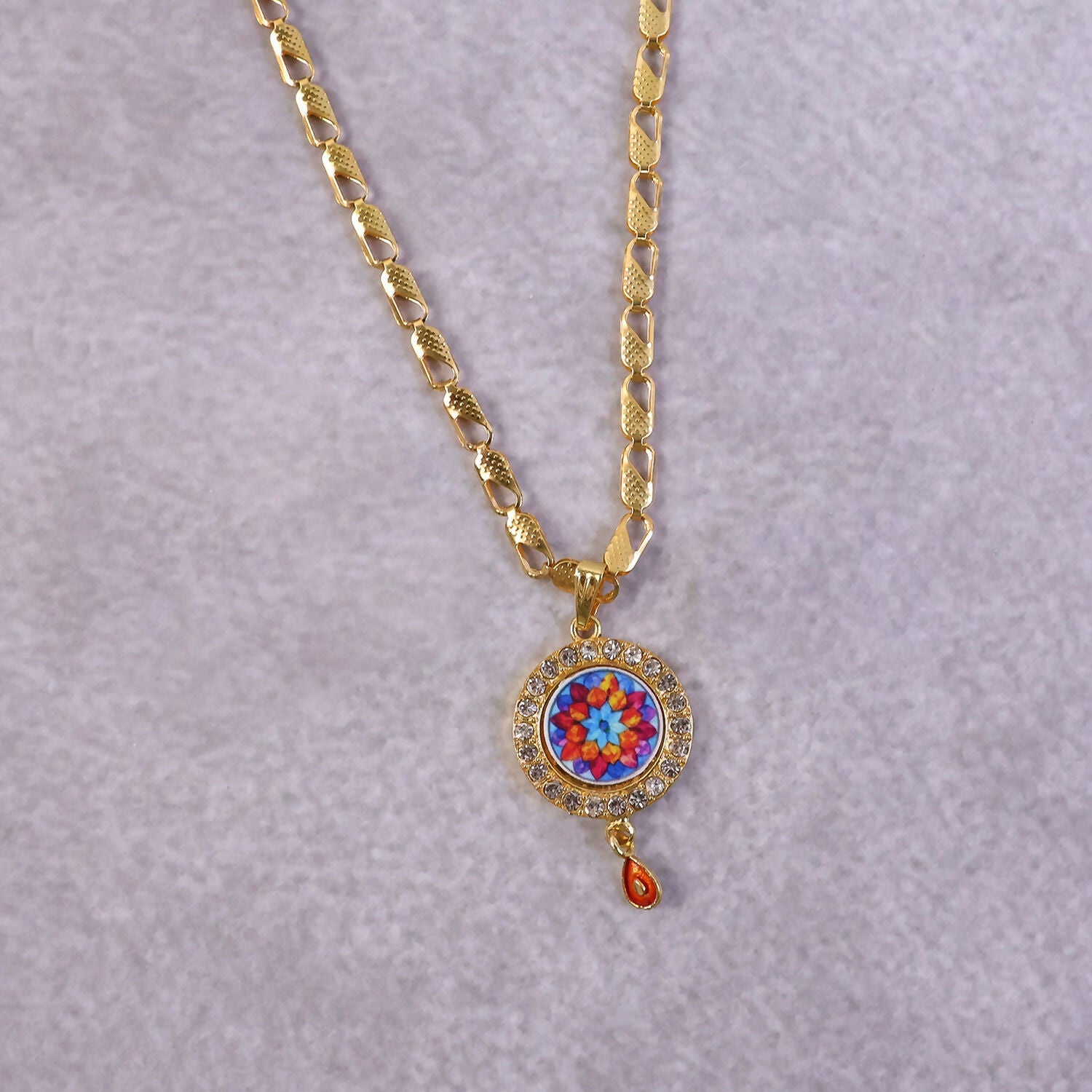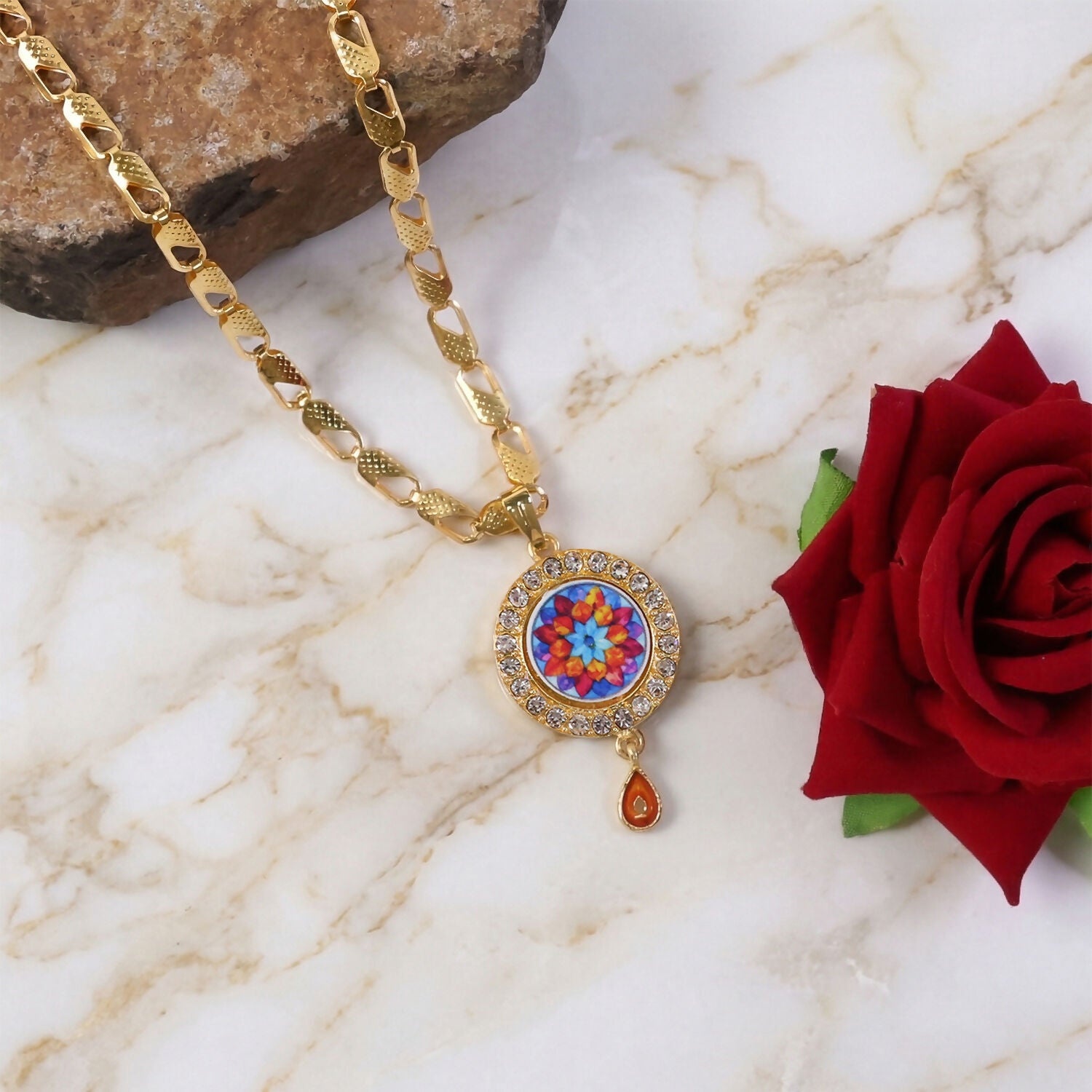 Enhance your style with this stunning gold pendant necklace featuring a vibrant multicolor floral design at the center. Surrounded by a sparkling stone-studded border and finished with a delicate drop accent, this piece blends elegance with modern charm. The premium gold-toned chain adds a luxurious touch, making it perfect for festive occasions, weddings, or everyday sophistication. A timeless accessory that effortlessly elevates any outfit.