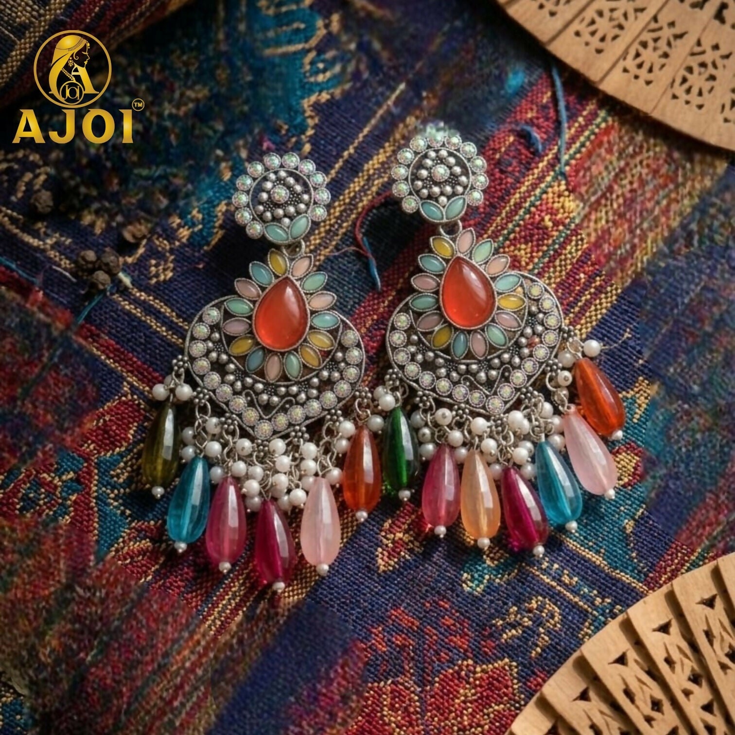 Exquisite oxidized earrings featuring a bold teardrop centerpiece surrounded by delicate pastel stones and intricate detailing. Accented with vibrant multicolor bead drops and elegant pearl tassels, these earrings bring graceful movement and charm. Perfect for festive occasions, weddings, and ethnic ensembles, they offer a unique blend of traditional craftsmanship and modern style while remaining lightweight and comfortable.