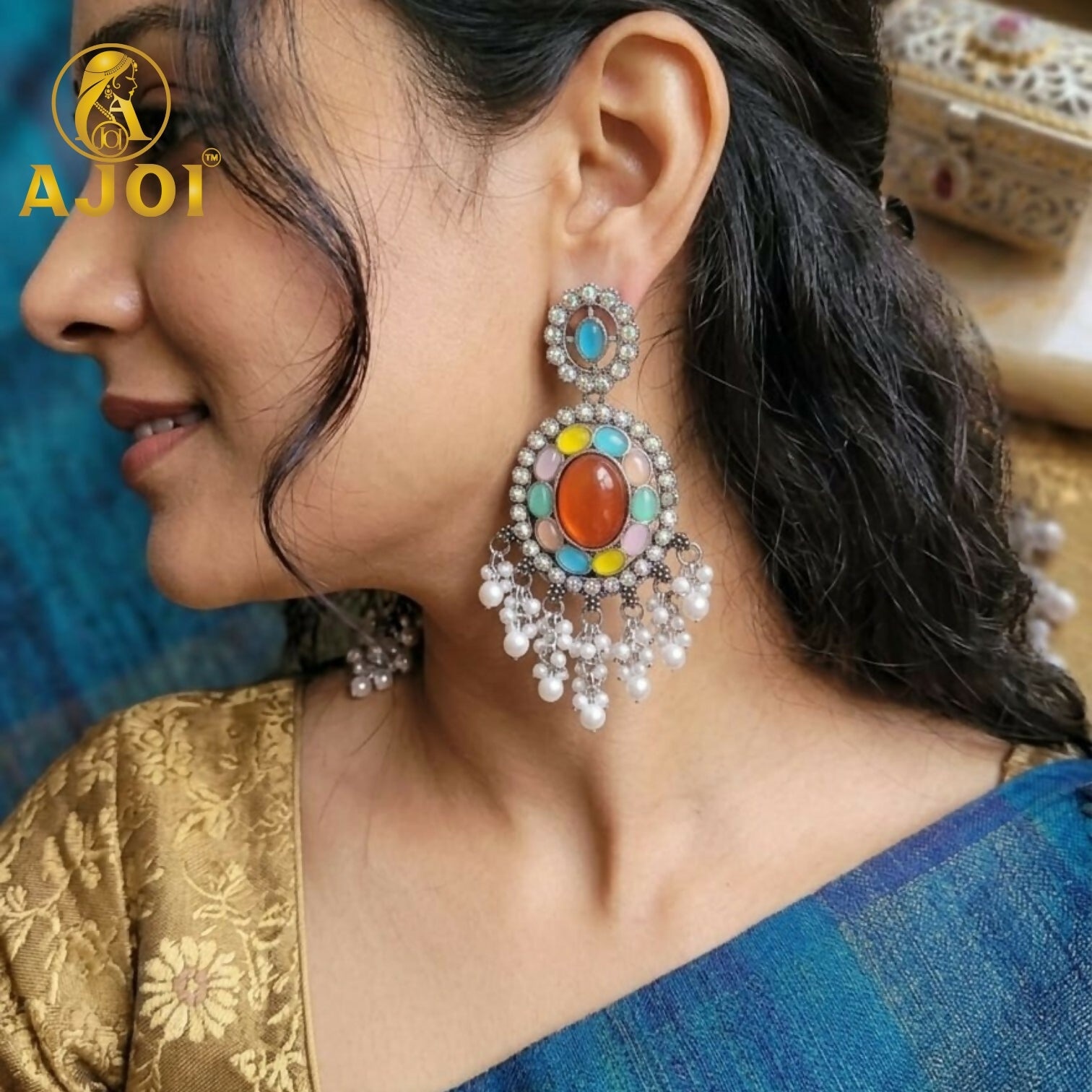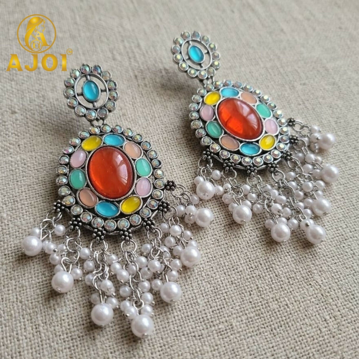 Elegant oxidized earrings featuring a bold oval centerpiece accented with vibrant multicolor stones and shimmering detailing. The intricate craftsmanship is enhanced with delicate pearl tassel drops that add graceful movement and charm. Perfect for festive occasions, weddings, and ethnic wear, these statement earrings combine traditional artistry with a modern touch while remaining lightweight and comfortable for all-day wear.