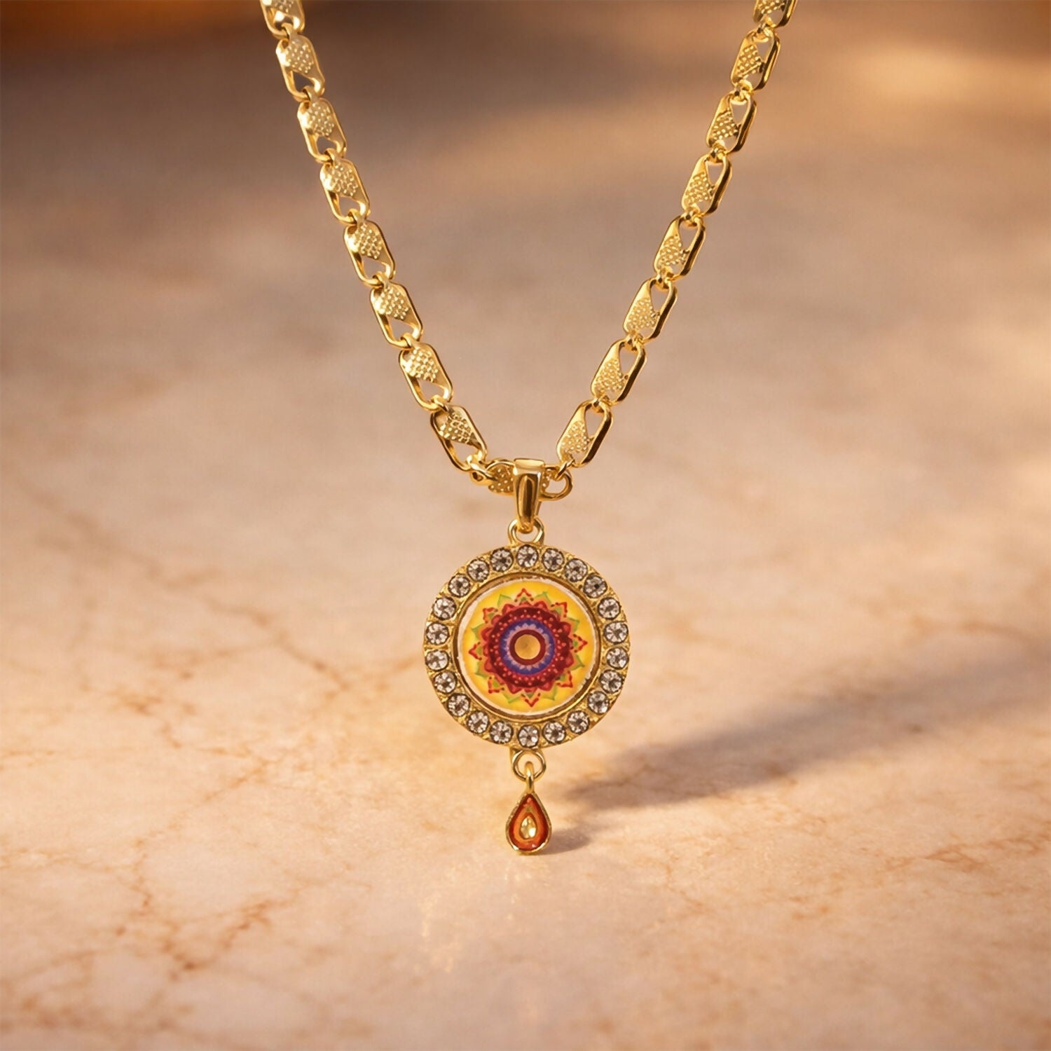 Enhance your look with this elegant gold pendant necklace featuring a vibrant mandala design at the center, surrounded by sparkling stone detailing. The intricate craftsmanship and rich colors create a perfect blend of tradition and modern style. Ideal for festive wear or special occasions, this piece adds a graceful and eye-catching touch to any outfit.