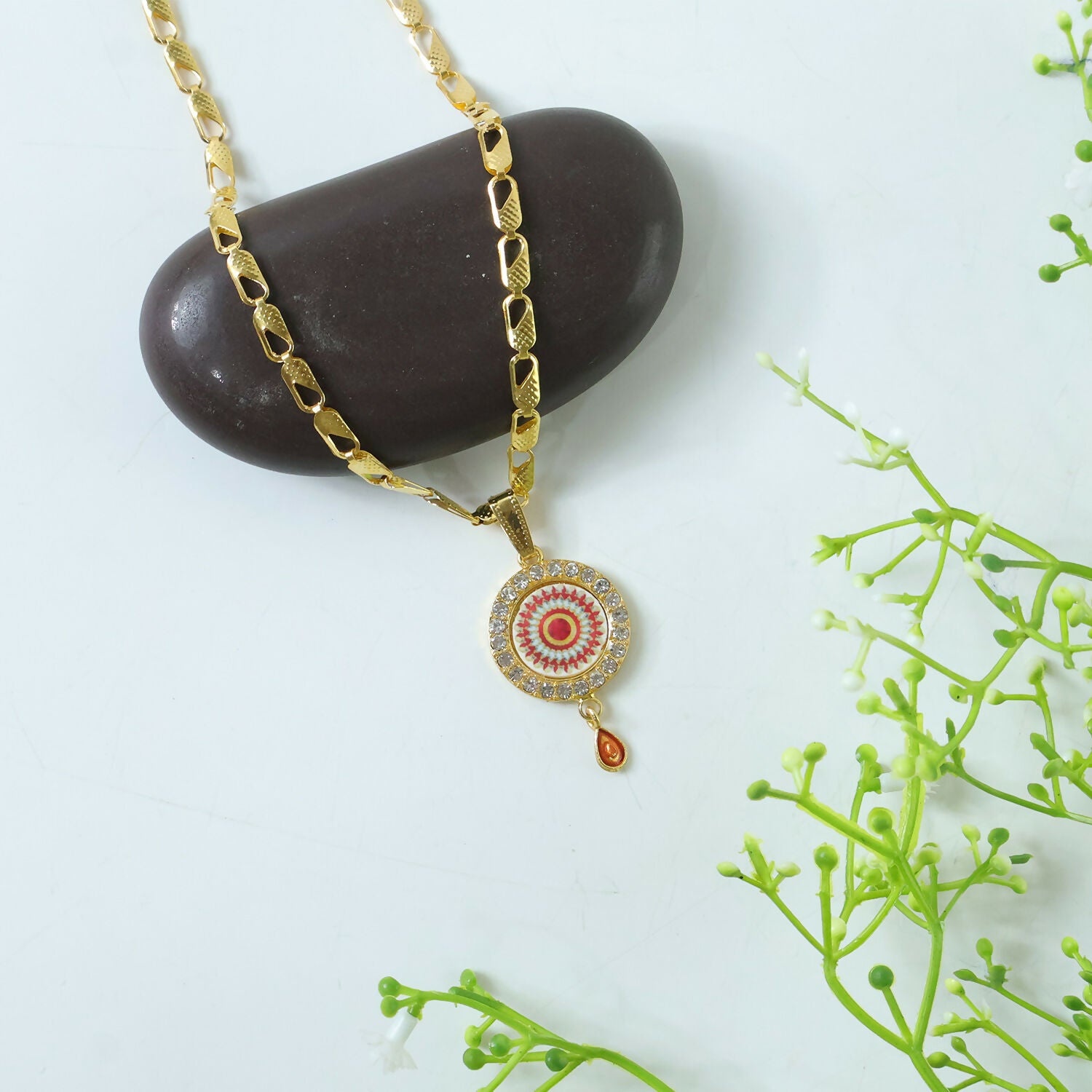 Make a bold statement with this royal gold pendant necklace featuring a beautifully detailed circular design accented with vibrant enamel and sparkling stones. The intricate pattern and rich color tones give it a luxurious and traditional appeal. Perfect for special occasions or festive wear, this elegant piece adds a touch of sophistication and charm to any look.