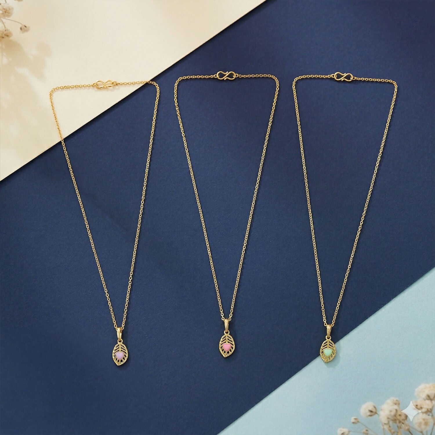 Enhance your style with these elegant gold pendant necklaces featuring a delicate leaf design and a charming enamel heart at the center. Crafted with fine detailing and a polished finish, each piece adds a subtle touch of romance and sophistication. Perfect for everyday wear or as a meaningful gift, these lightweight necklaces complement any outfit beautifully.
