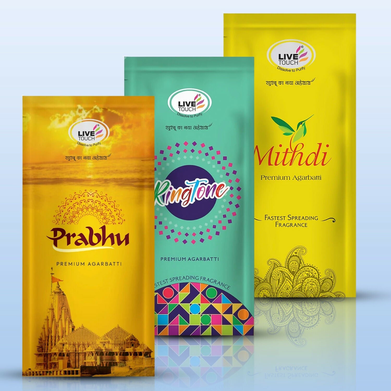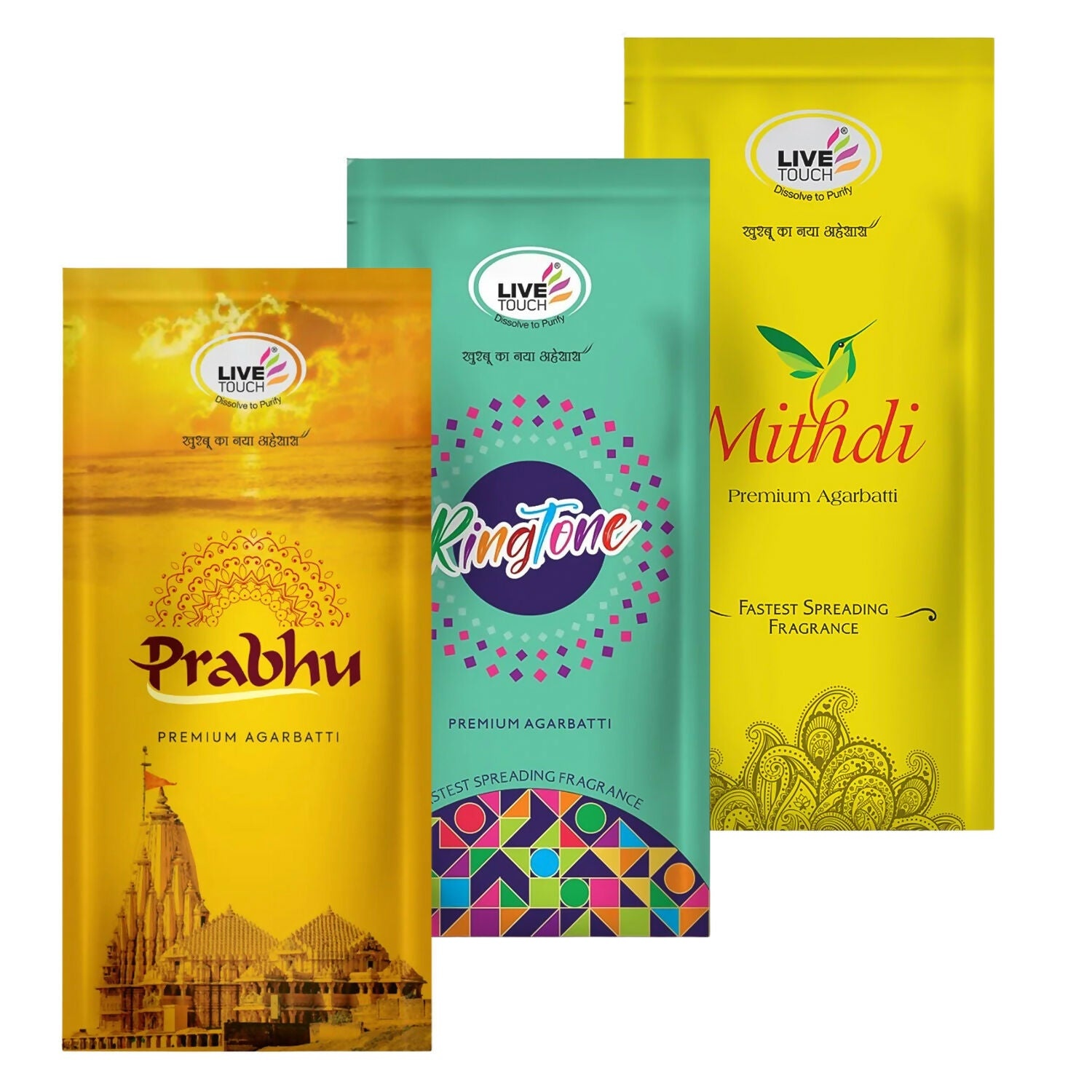 The Live Touch Premium Agarbatti Combo Pack brings together three unique fragrances in one value pack. Each pouch contains 100g of incense sticks, giving you a total of 600g of premium agarbattis. Perfect for prayer, meditation, yoga, or simply filling your home with soothing aromas, this combo offers variety and long-lasting freshness.