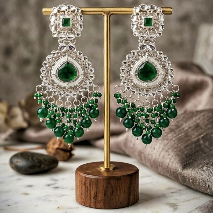 Styling Tip: Pair these with a deep green silk saree or a contrasting cream-colored lehenga to let the emerald tones truly pop. Keep your necklace minimal to allow these chandelier drops to be the star of the show.