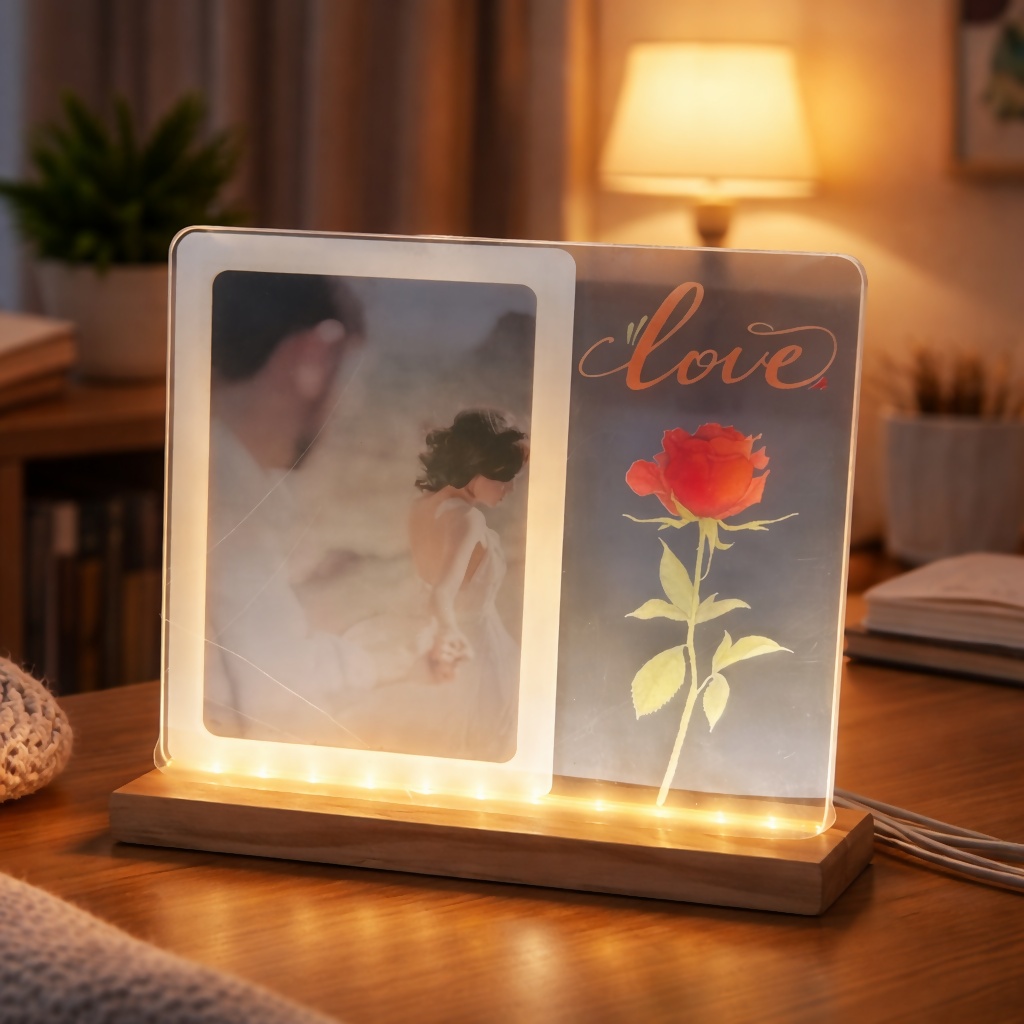 led photo frame, acrylic photo frame, couple photo frame, romantic gift, led desk decor, bedroom decoration, love frame gift, wooden base frame, anniversary gift, photo display stand, decorative frame, gifting item, led night decor, table decor item