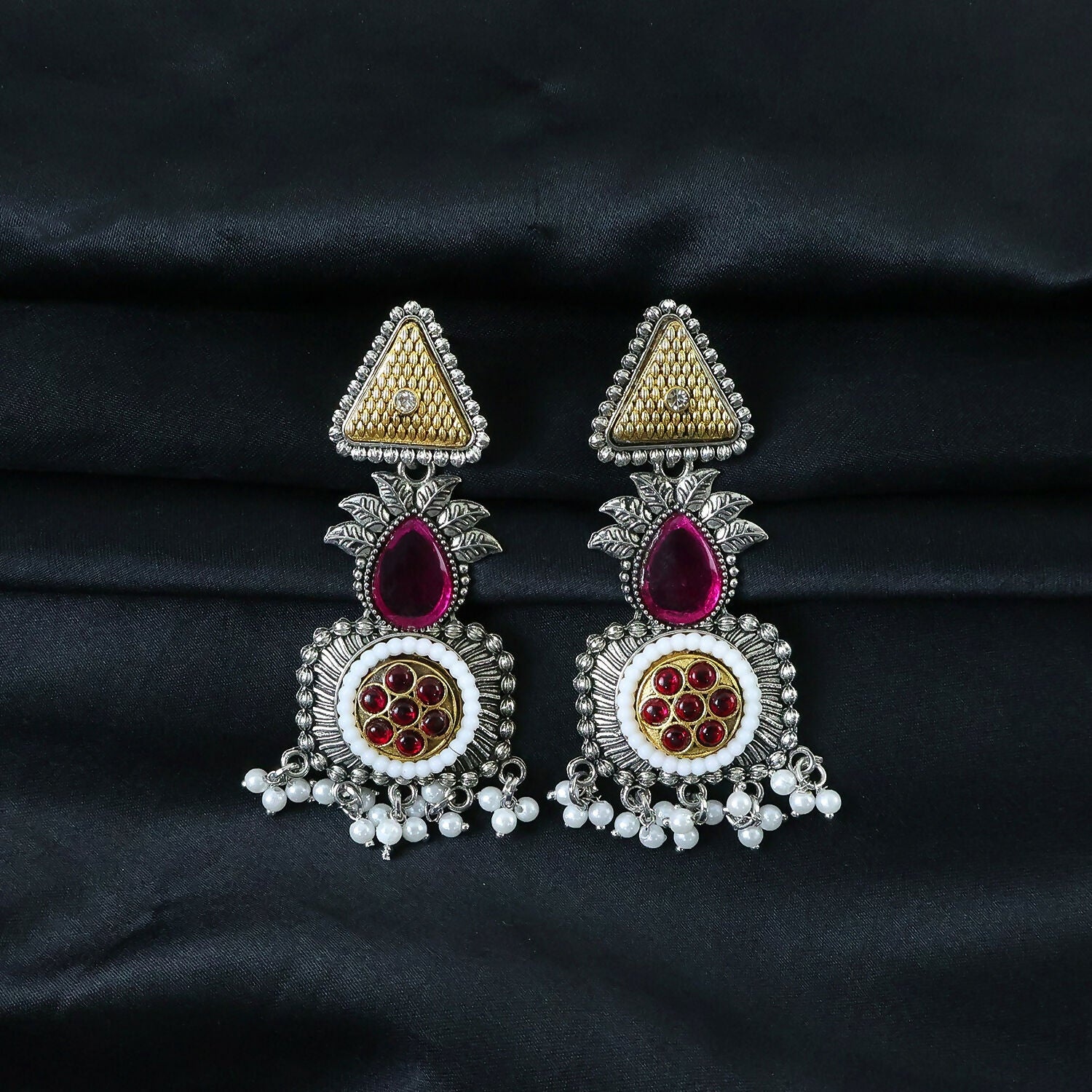 Add a touch of timeless elegance to your jewelry collection with these beautifully crafted oxidized silver statement earrings. Designed with a striking blend of traditional artistry and bold color, the earrings begin with a textured gold-tone triangular stud that brings a unique geometric charm.
