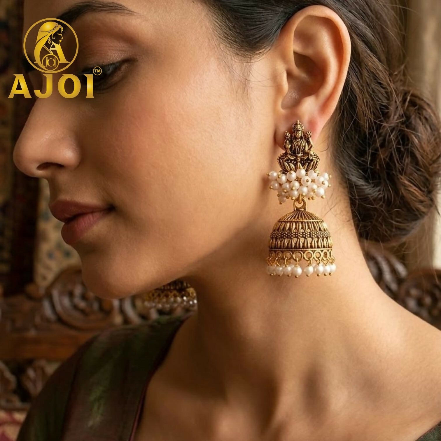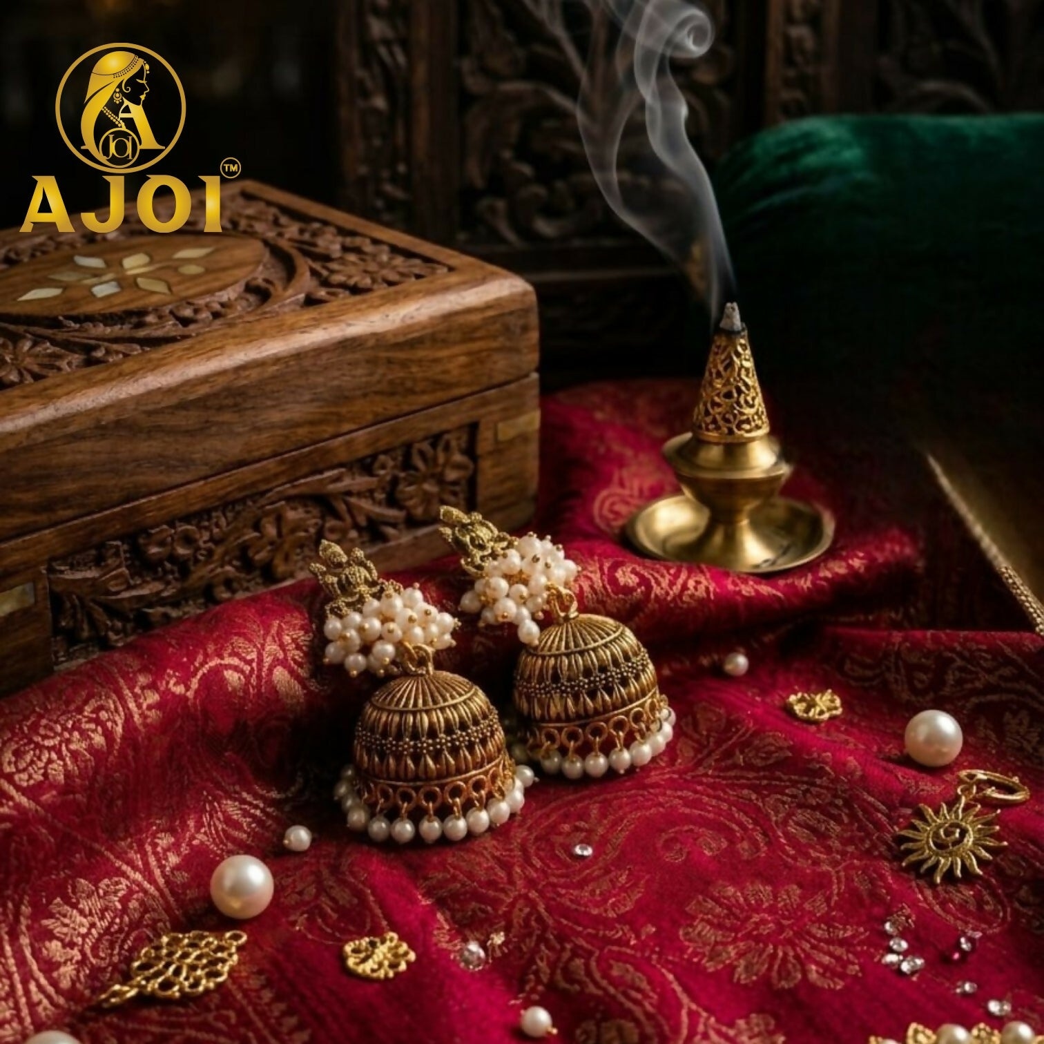 Add a touch of royal elegance to your ethnic look with these antique gold pearl jhumka earrings. Featuring intricate temple-inspired detailing with delicate pearl clusters and a classic dome design, these earrings beautifully complement sarees, lehengas, and festive outfits. Perfect for weddings, festivals, and special occasions.