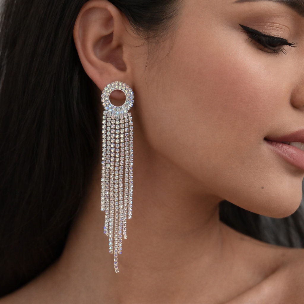 Add a touch of glamour to your look with these stunning crystal tassel earrings. Designed with a sparkling circular stud top encrusted with high-shine rhinestones, these earrings feature cascading strands of shimmering crystals that create a luxurious and eye-catching effect.