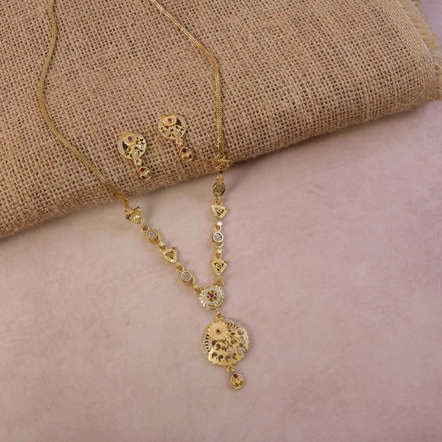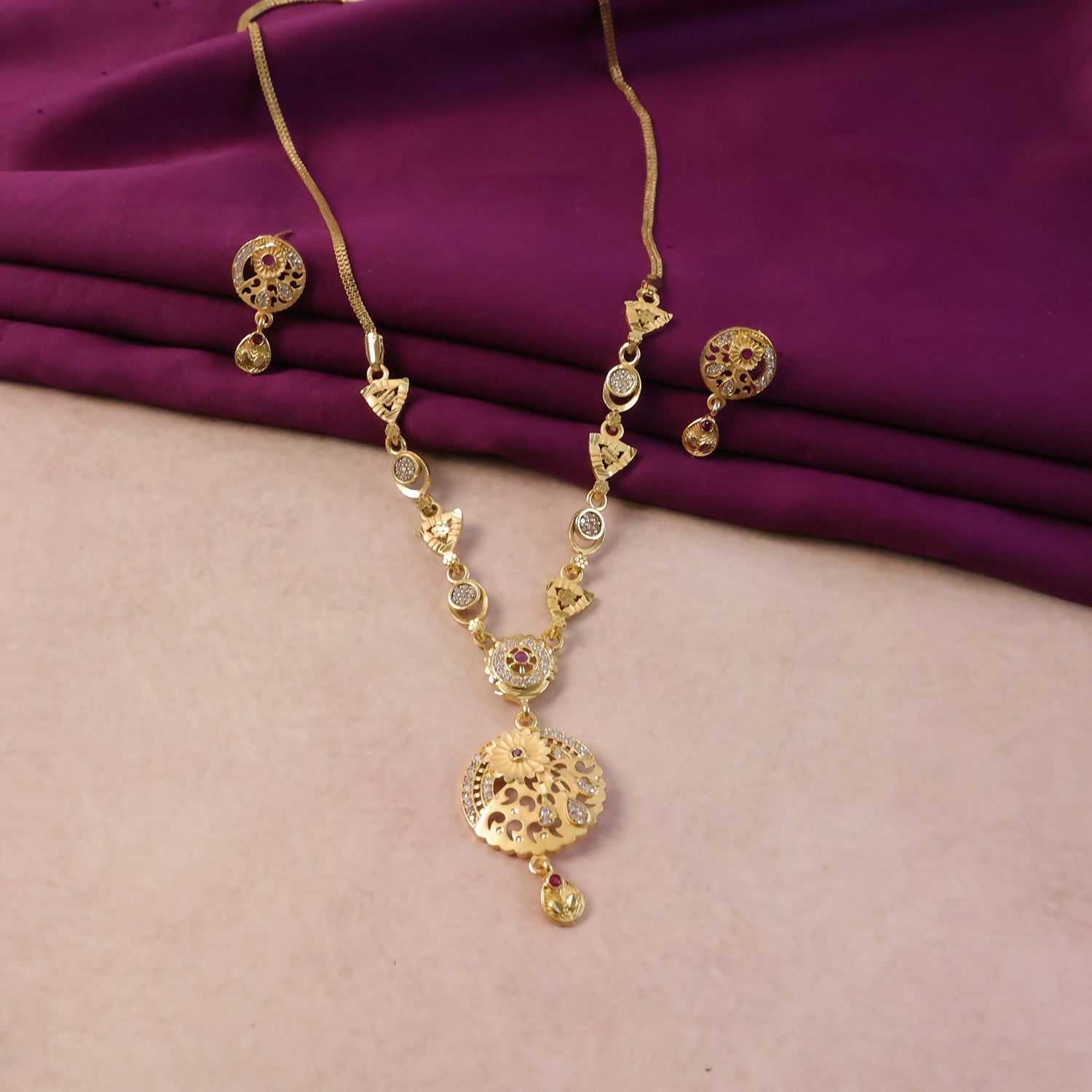 Classic Gold-Tone Floral Engraved Pendant Necklace Set with Designer Stud Earrings