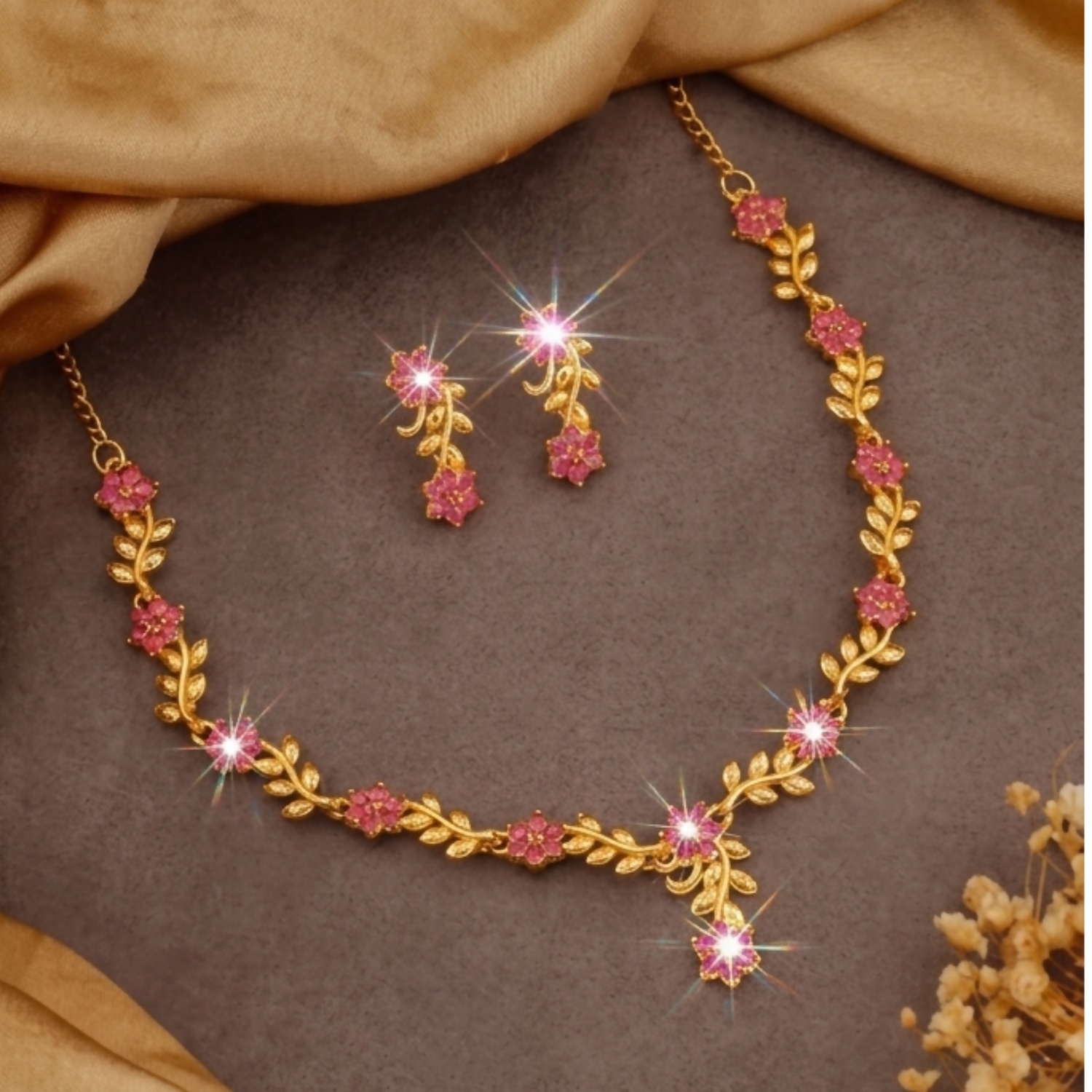 Matching earrings are placed above the necklace. Each earring features a similar floral and leaf motif, maintaining a cohesive design with the necklace.