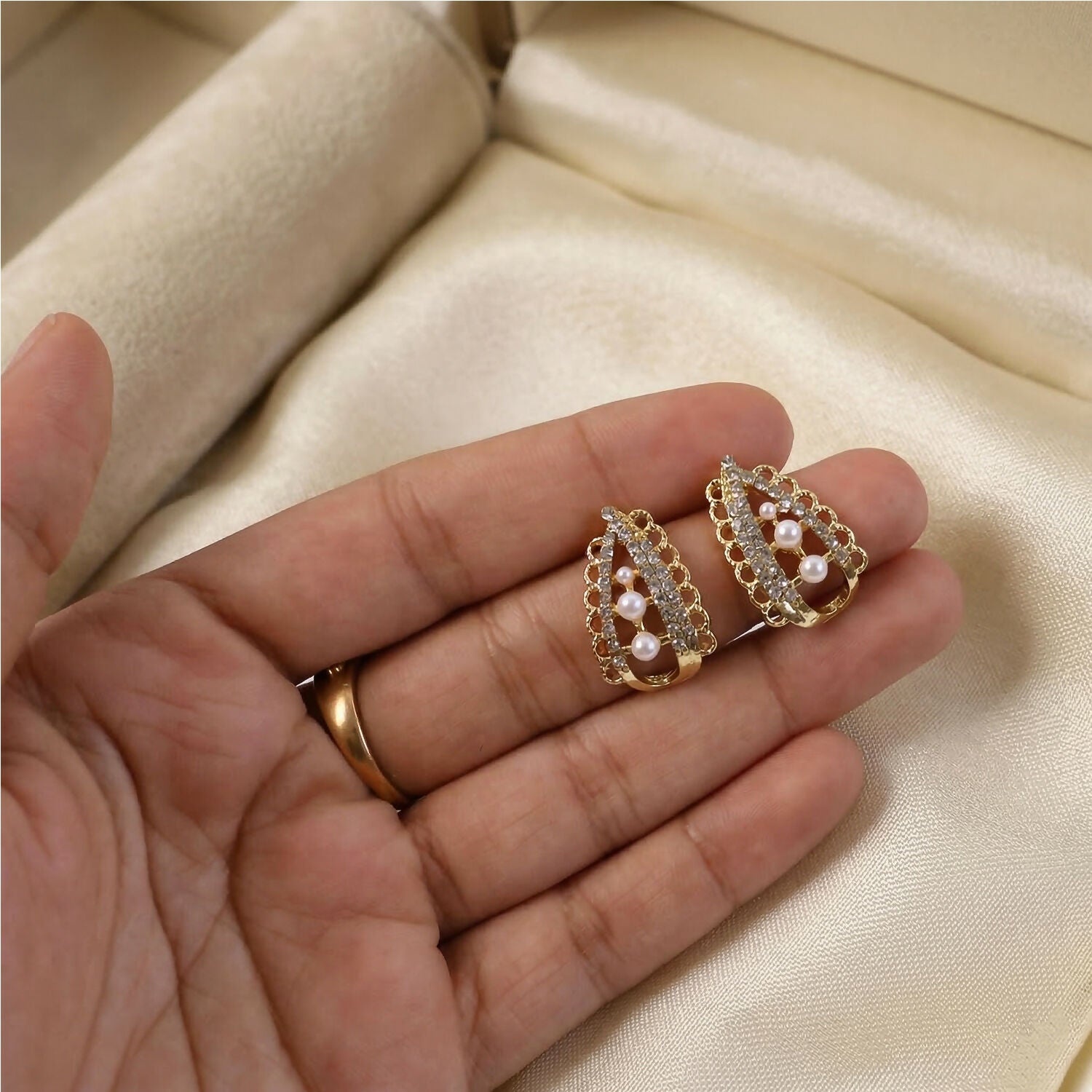 Design: These earrings feature a unique arched silhouette encrusted with micro-crystals. The center is adorned with three vertically aligned pearls of graduating sizes, flanked by delicate golden lace-like detailing on the sides.