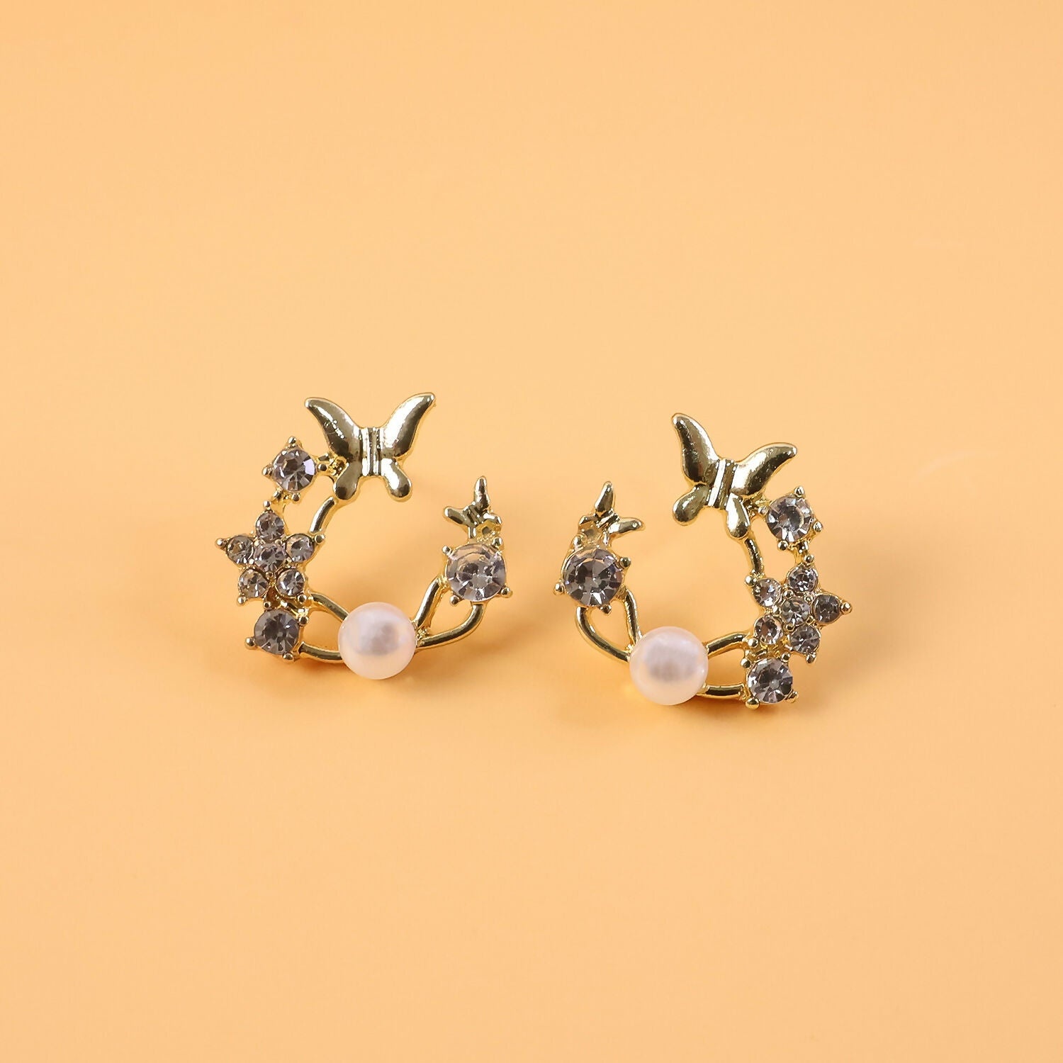 Design: These intricate studs feature a dainty golden butterfly and shimmering crystal flowers arranged in a graceful semi-wreath. A single, high-luster pearl sits at the center, completing this whimsical and feminine design.