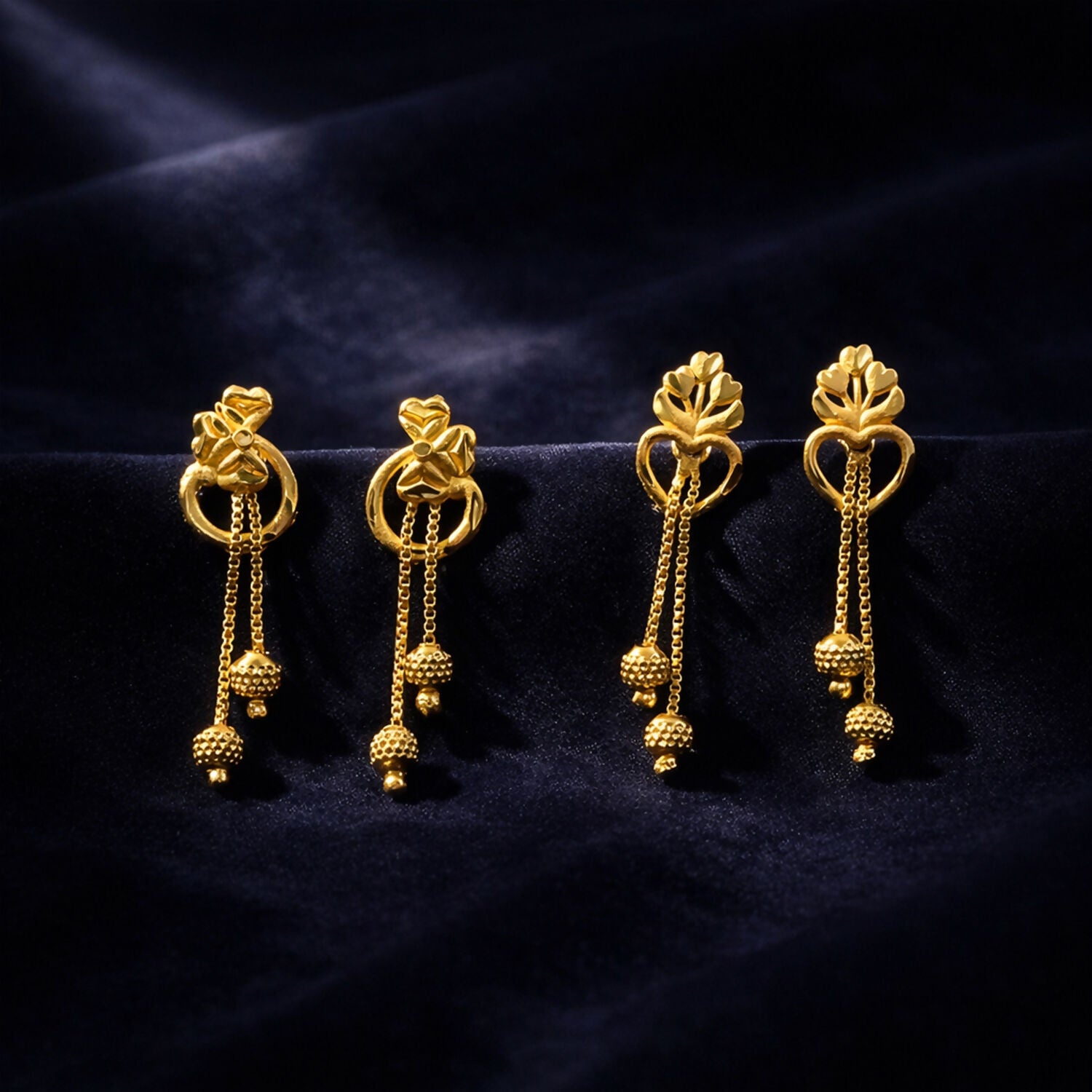 From the heart-shaped centerpiece, three fine gold chains gently cascade downward, each ending with textured gold bead drops that add subtle shine and movement. These delicate dangling elements catch the light beautifully, creating a soft shimmer with every turn of your head. The balanced design ensures the earrings feel lightweight while still making a refined statement.